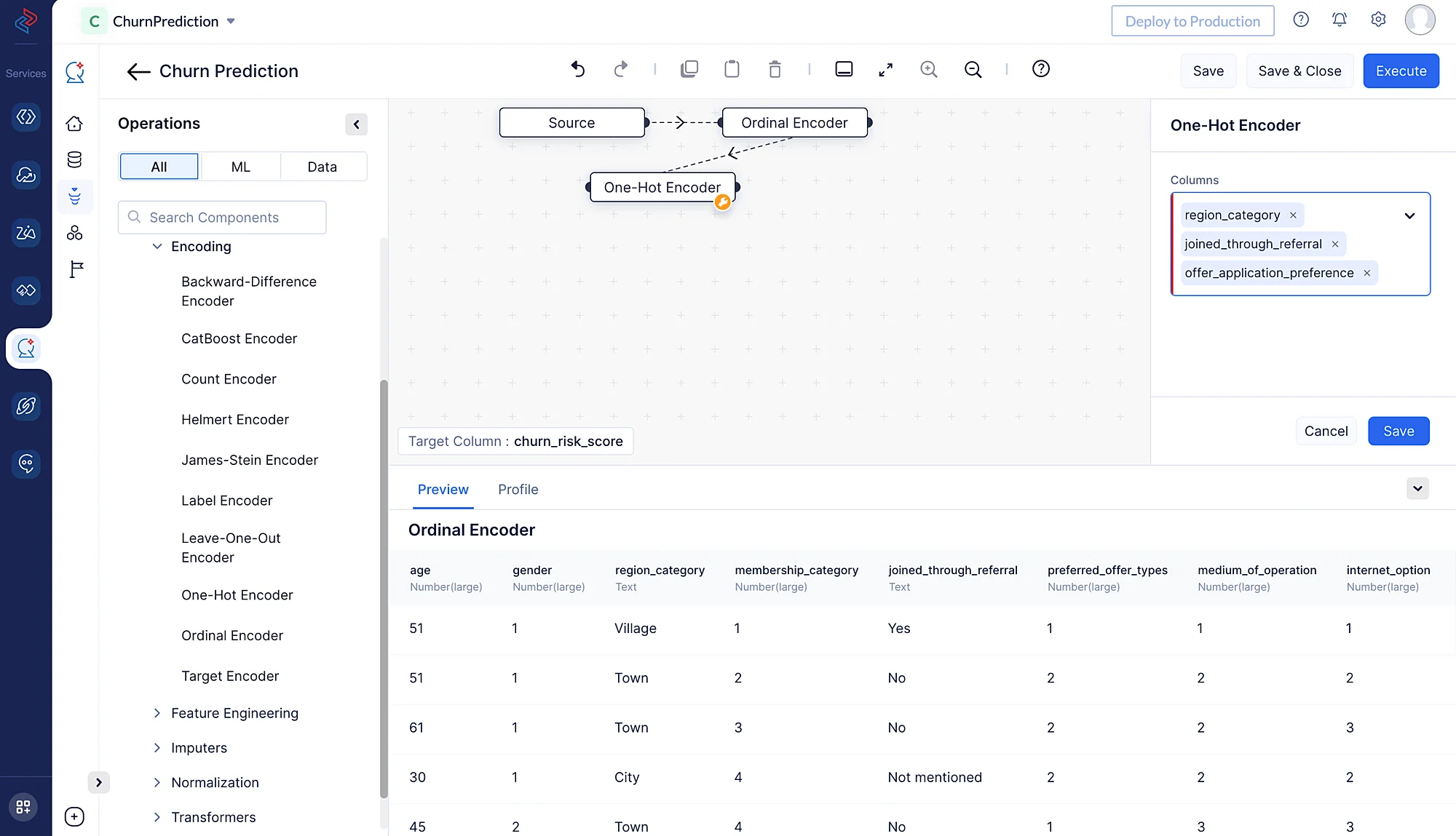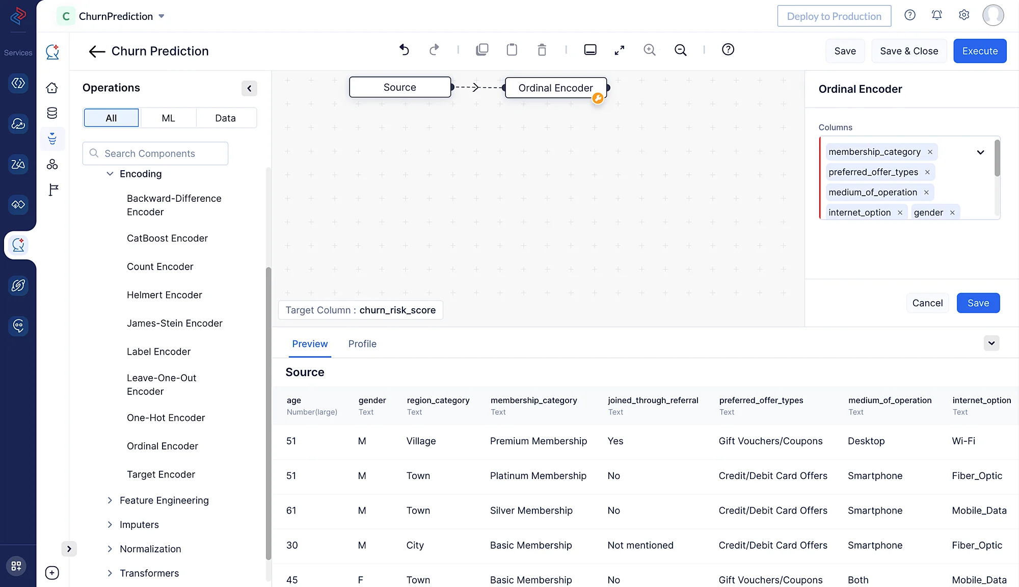 Here we are using ordinal encoding to encode the following categorical features: “membership_category”, preferred_offer_types", “medium_of_operation”, “internet_option”, “gender”, “used_special_discount”, “past_complaints”, “complaint_status” and “feedback”. It assigns integers to the categories based on their order, making it possible for machine learning algorithms to capture the ordinal nature of the data. We’ll use the Ordinal Encoder node by navigating to ML operations, clicking the ->Encoding component, and choosing-> Ordinal Encoder in QuickML to turn the selected category columns into numerical columns.