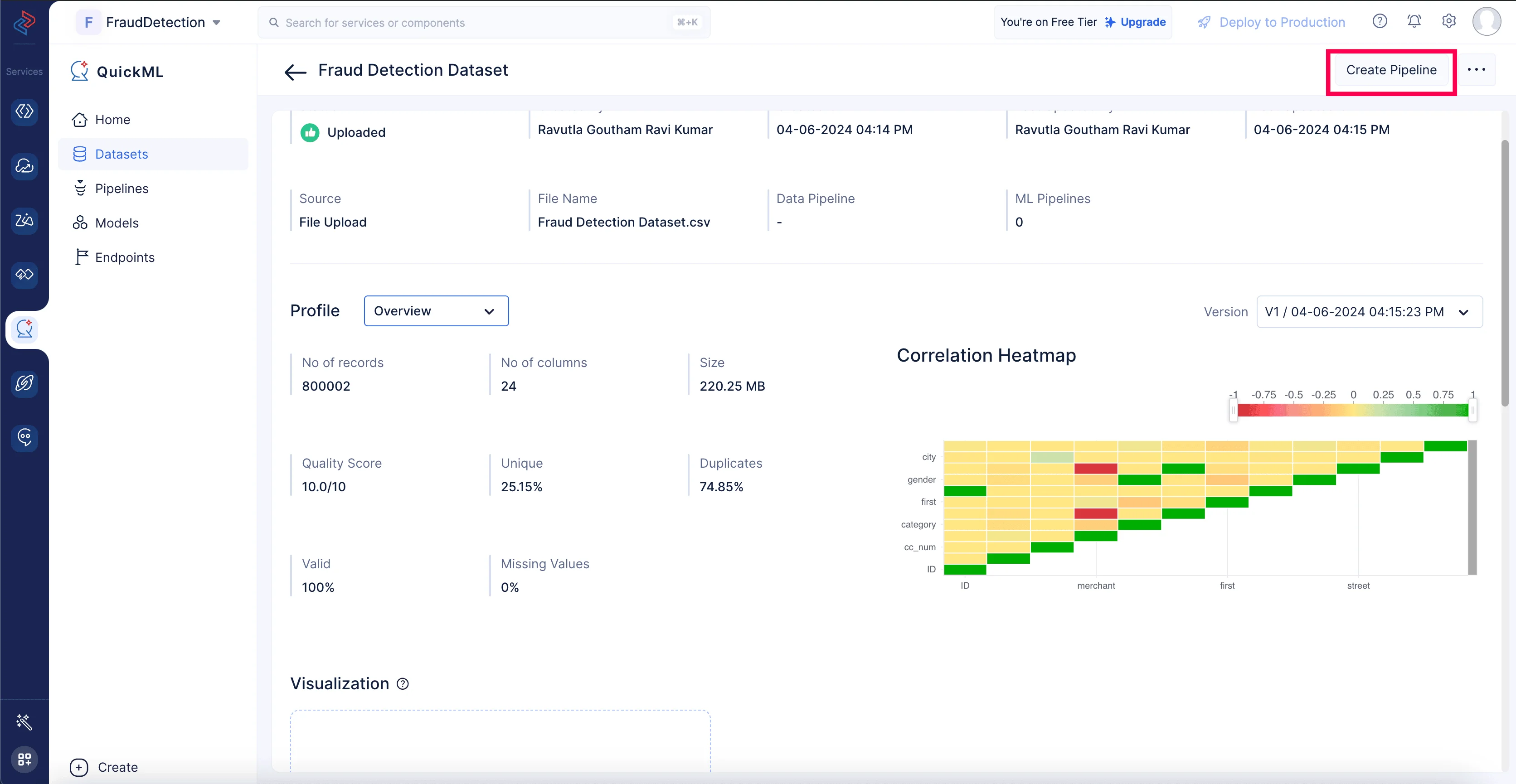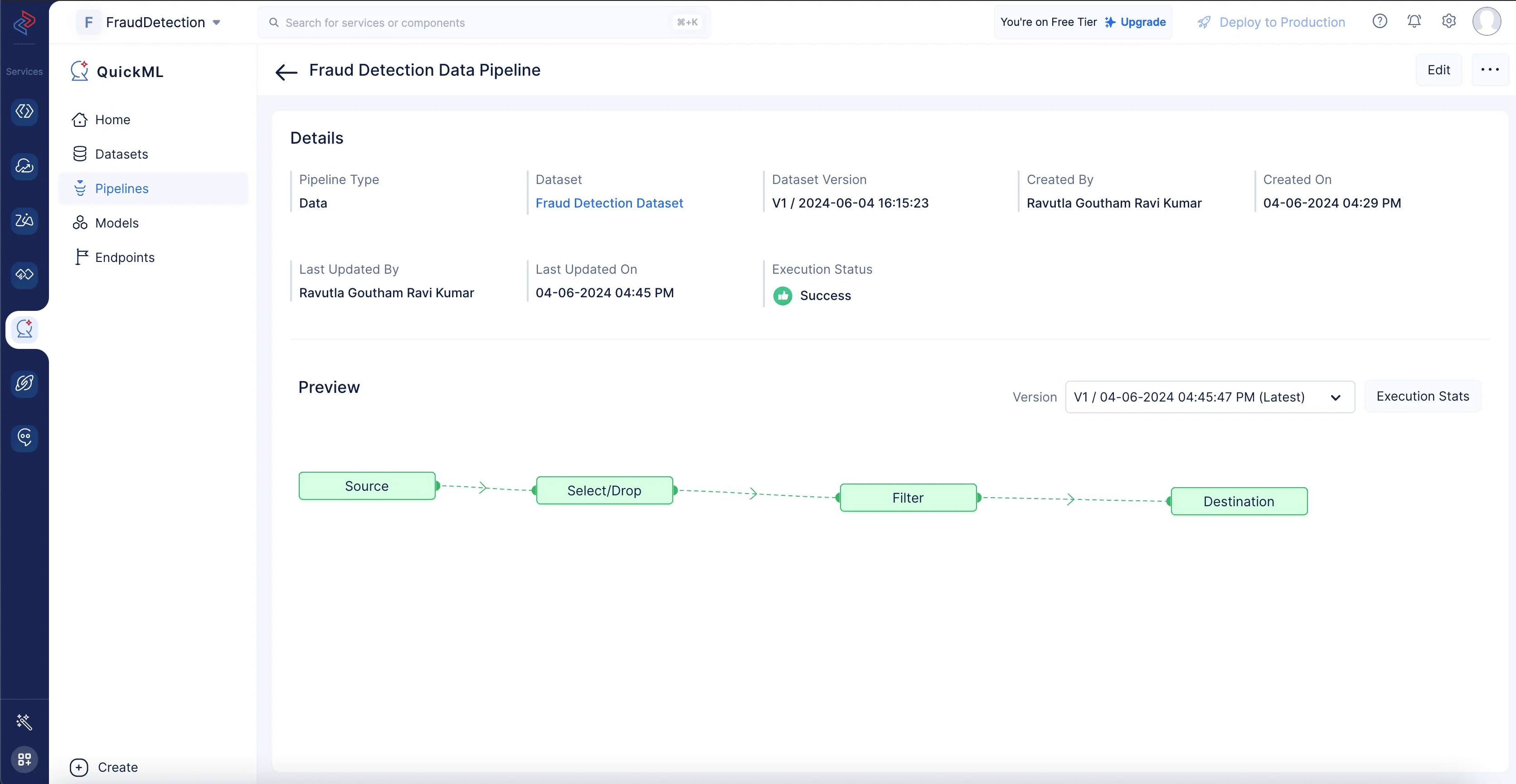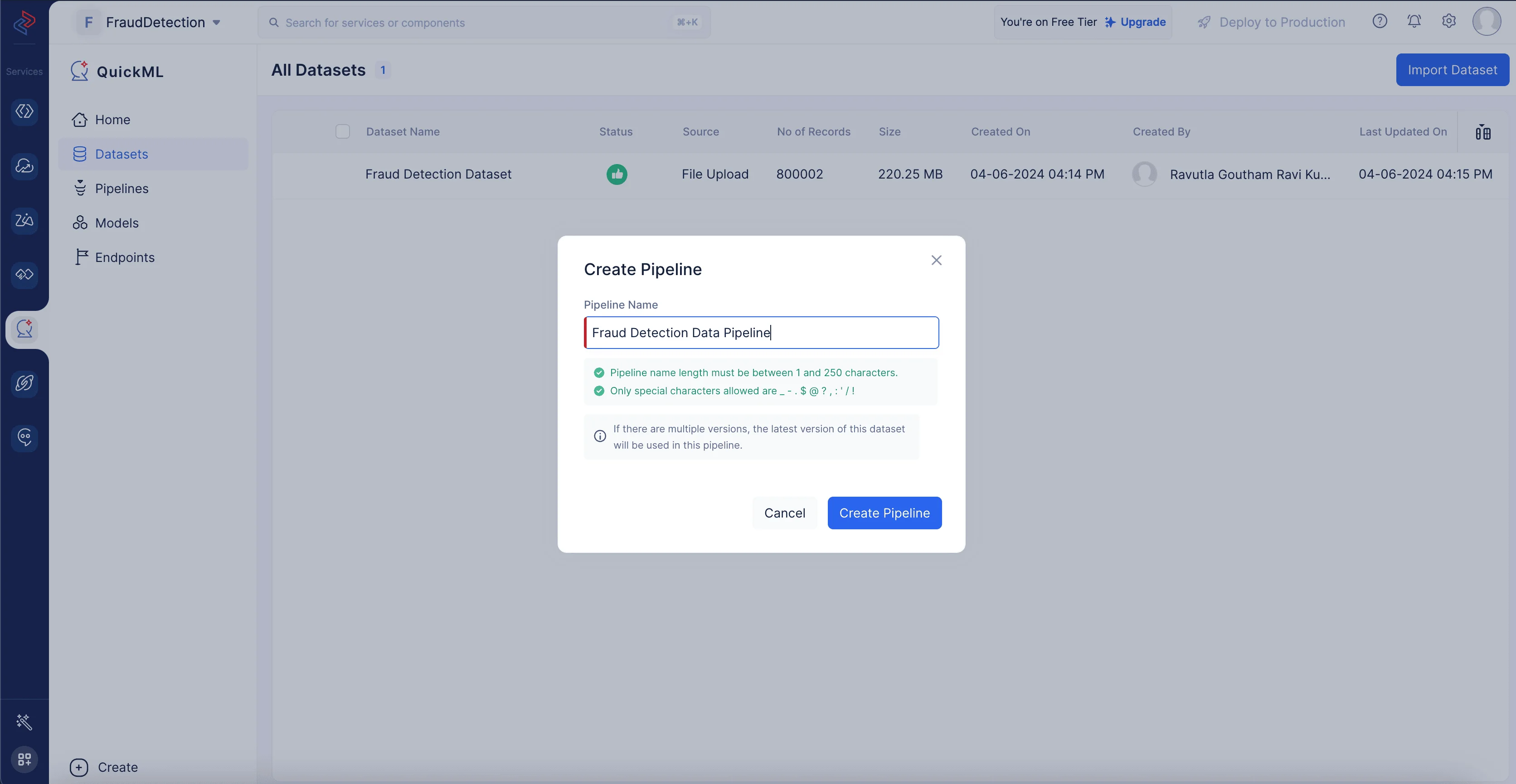 Name the pipeline “Fraud Detection Data Pipeline” and click Create Pipeline.