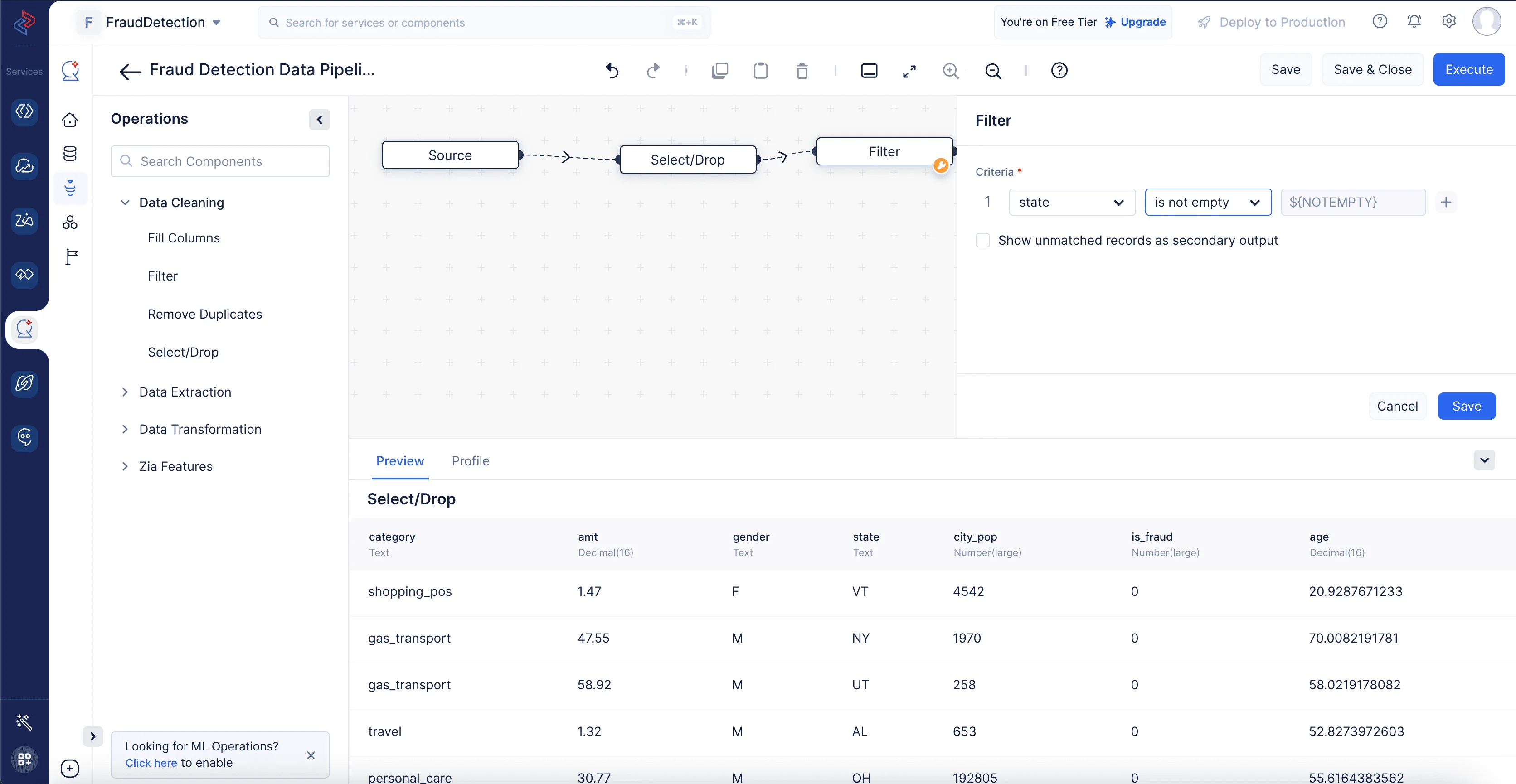Now, connect the Filter node to the Destination node. Once all the nodes are connected, click the Save button to save the pipeline. Then click on Execute button to execute the pipeline.