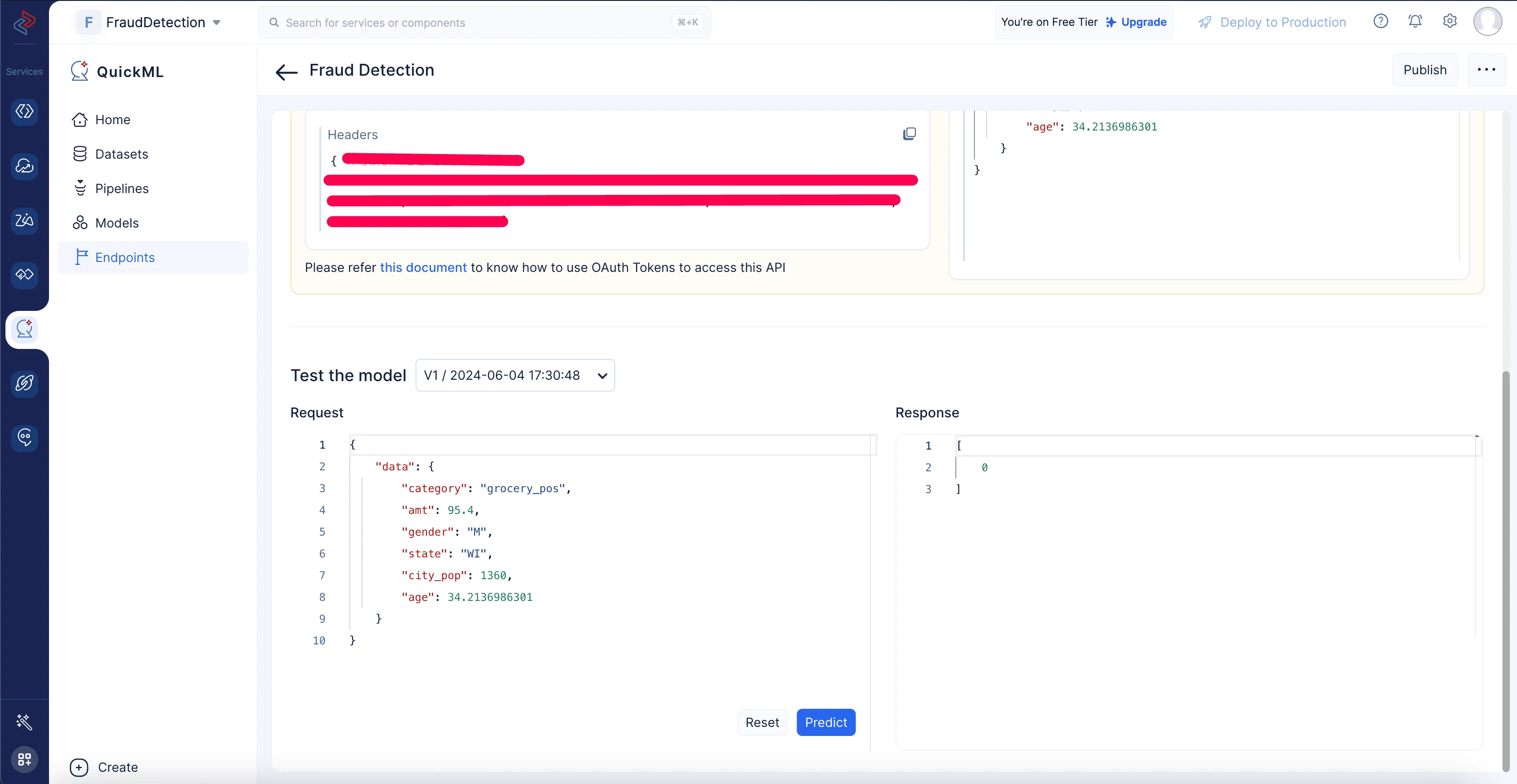 Click Publish and use the endpoint URL to integrate the ML model with any other applications.