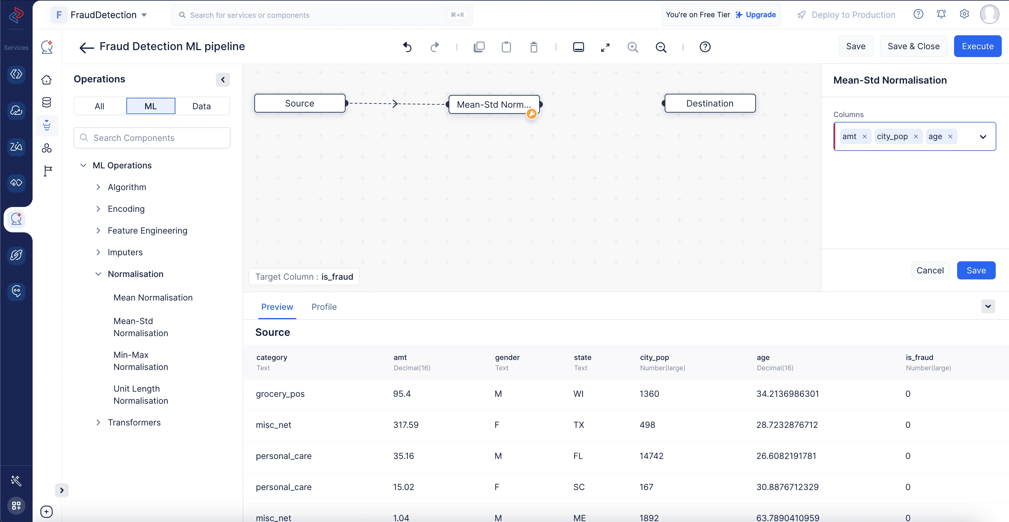 Since the values of the features “amt”, “city_pop”, “age” are in various ranges, we will use the Mean-Std Normalization component to scale down the values of the features to a common range, typically between 0 and 1. Navigate to ML operations->Normalization. Drag and drop the Mean-Std Normalization node to the ML pipeline builder interface. In the configuration box on the right panel, choose all the columns except “is_fraud” and click Save.