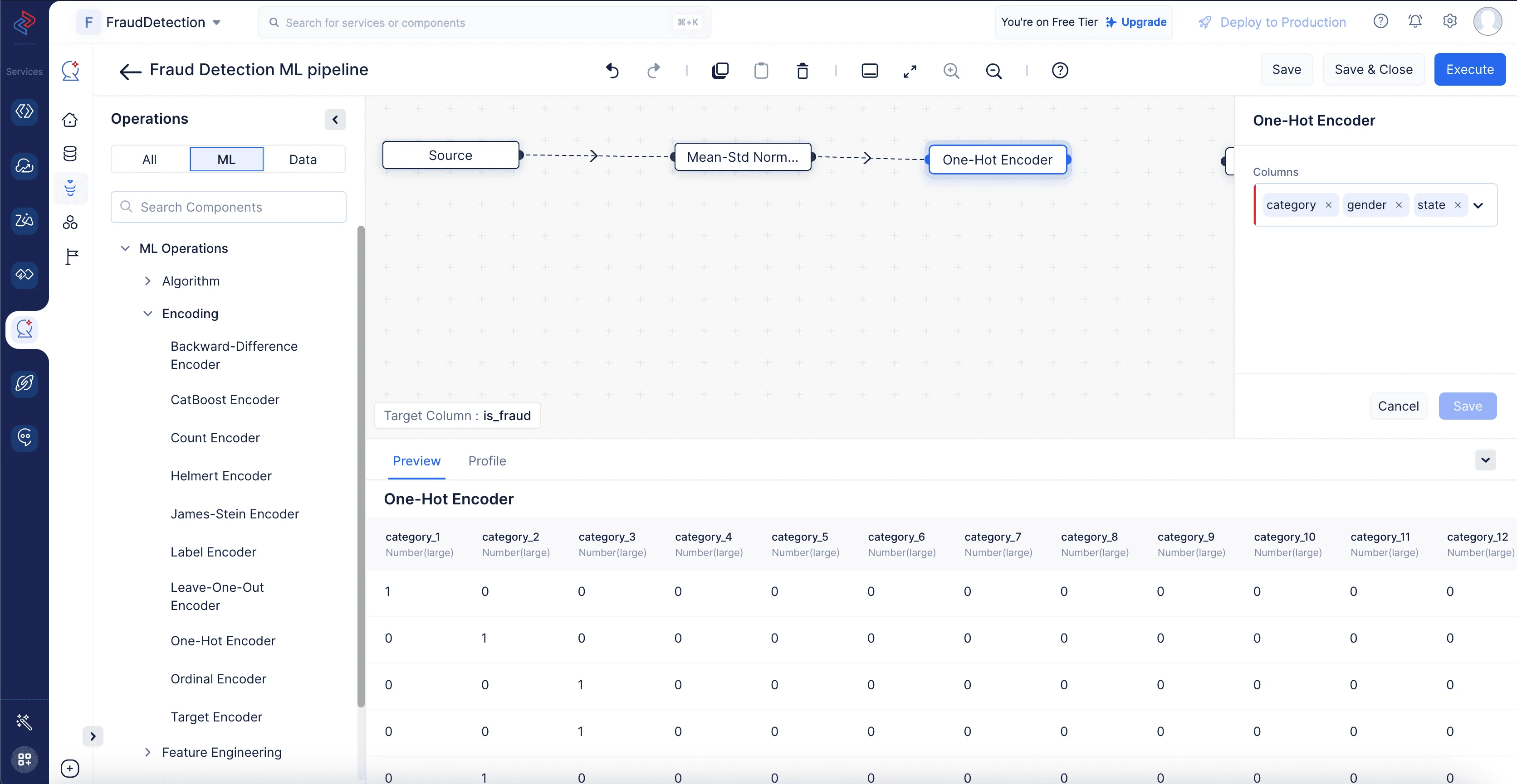 Here, we are using the One-Hot Encoder node to encode the following columns: “category”, “gender” and “state”. We’ll use the One-Hot Encoder node by navigating to ML operations, selecting the -> Encoding component and choosing -> One-Hot Encoder in QuickML to turn the selected category columns into numerical columns.