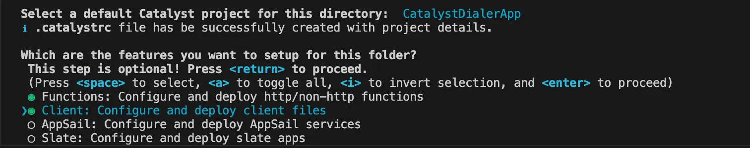 The CLI will now ask you to associate a Catalyst project with the directory. Associate it with the project that we created earlier from the console. Select CatalystDialerApp from the list and press Enter.
