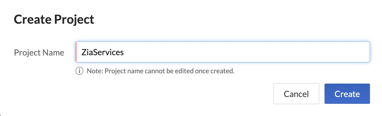 Enter the project’s name as “ZiaServices” in the pop-up window that appears.