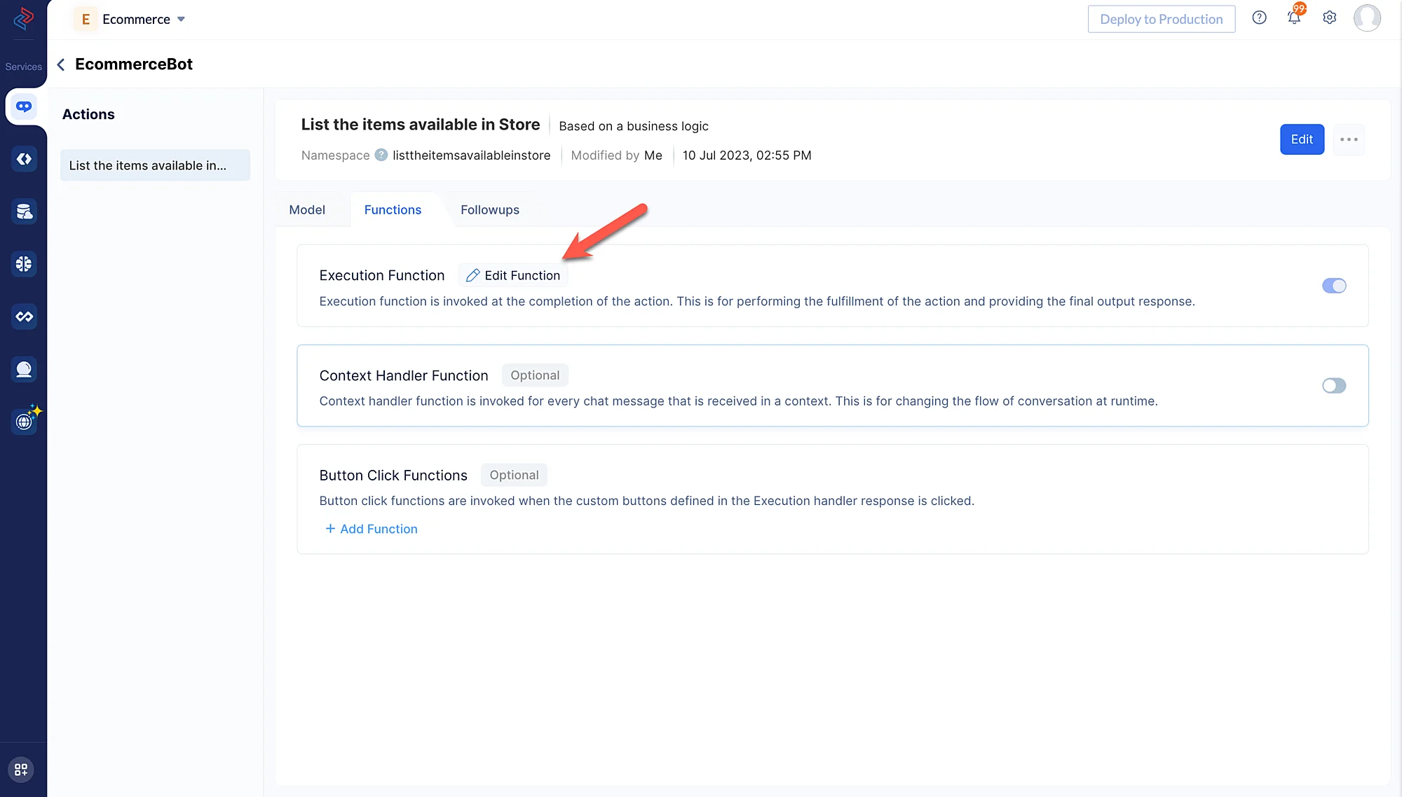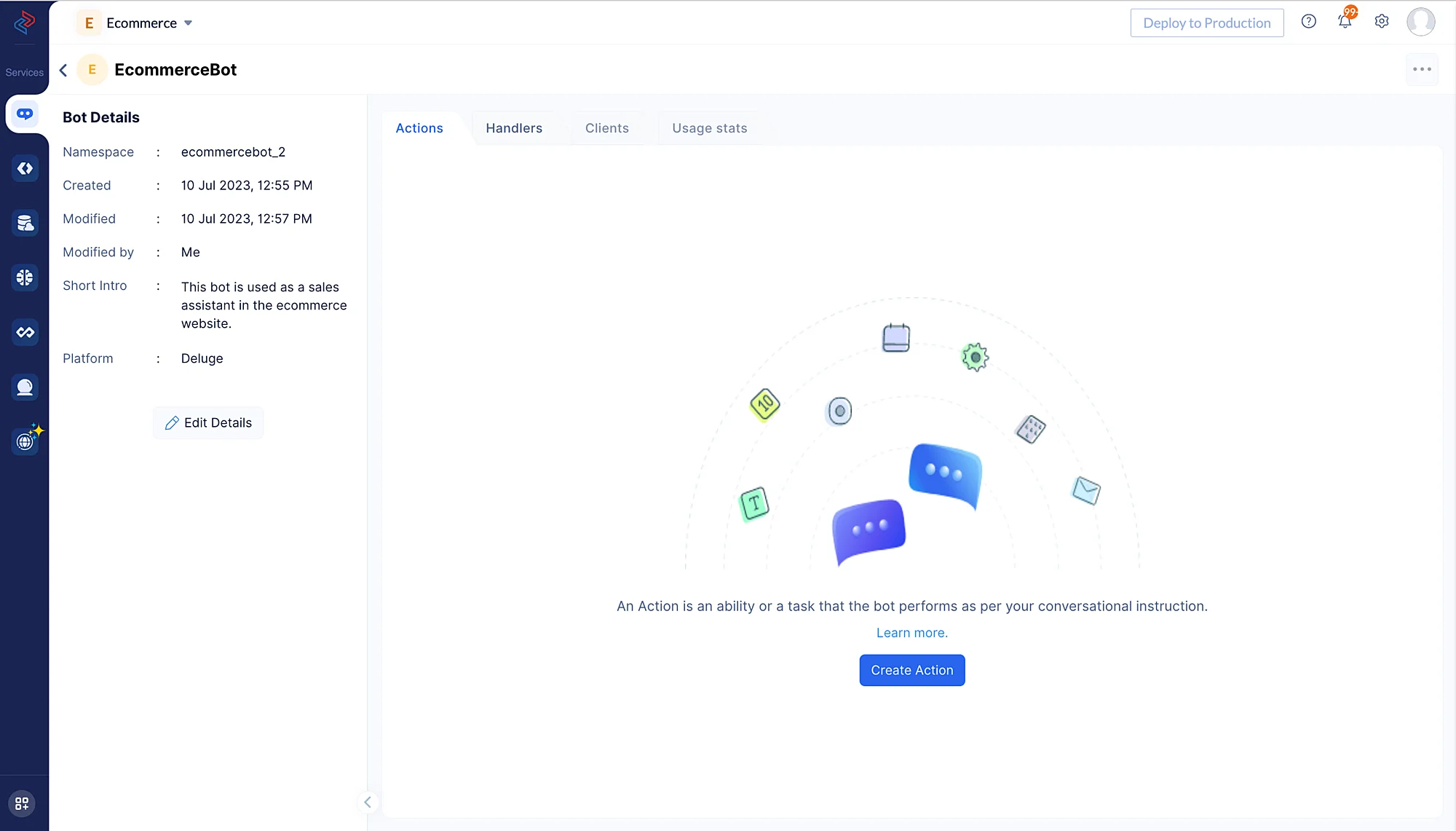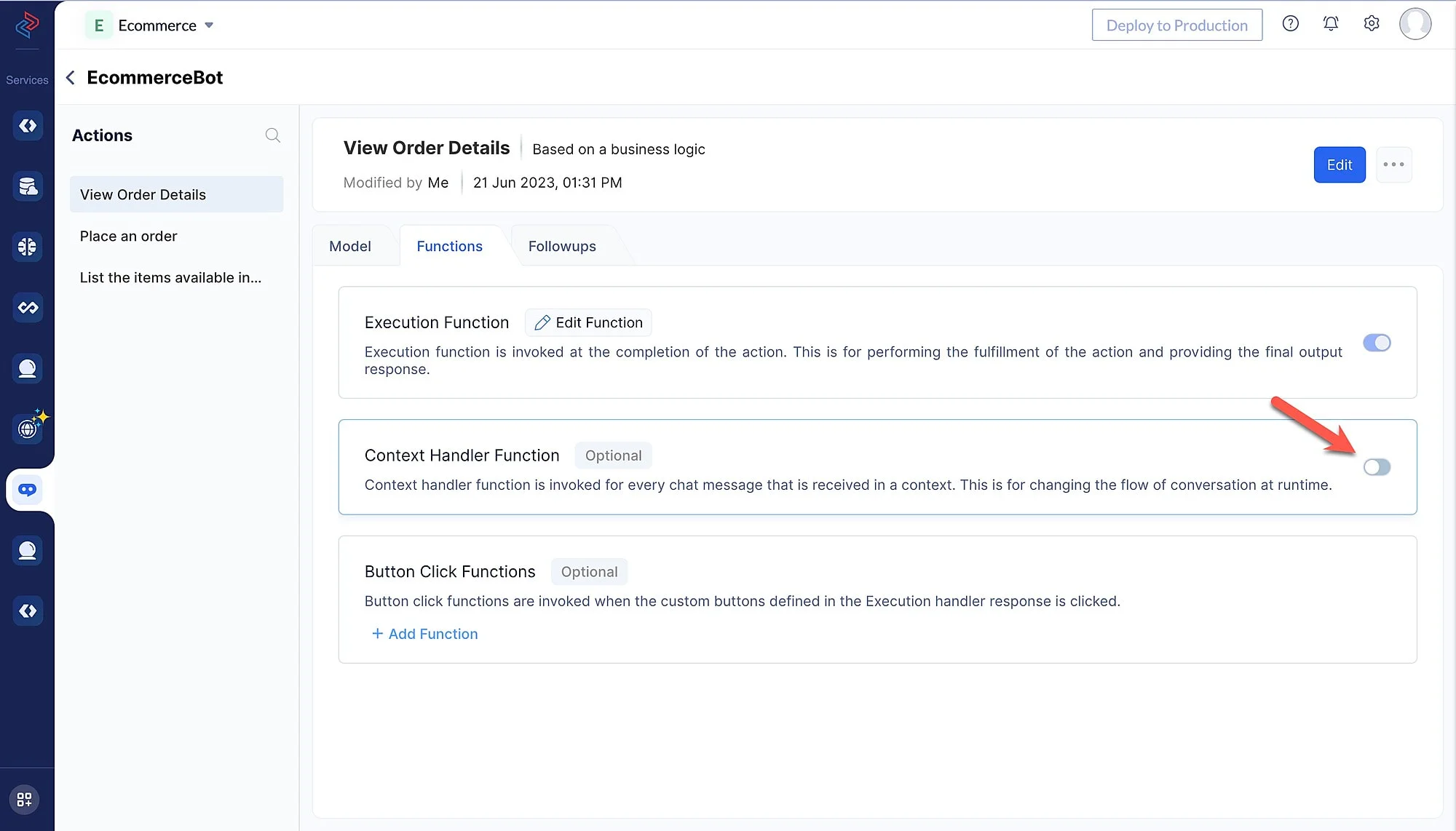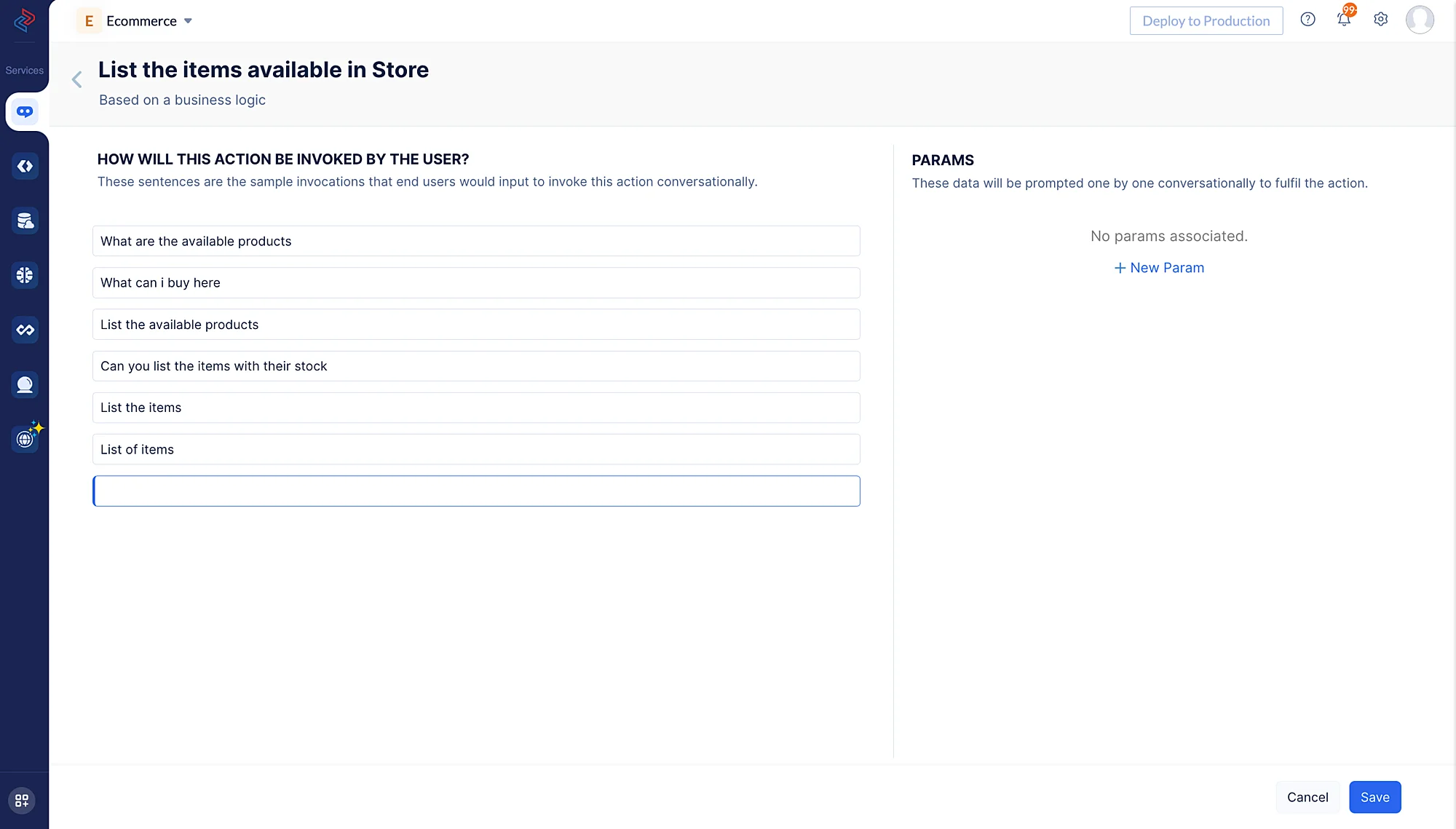 Similarly, we will create the remaining actions of the ecommerce bot. The above mentioned steps will apply to all actions, additionally you might be required to create params and configure the logic in a context handler function.