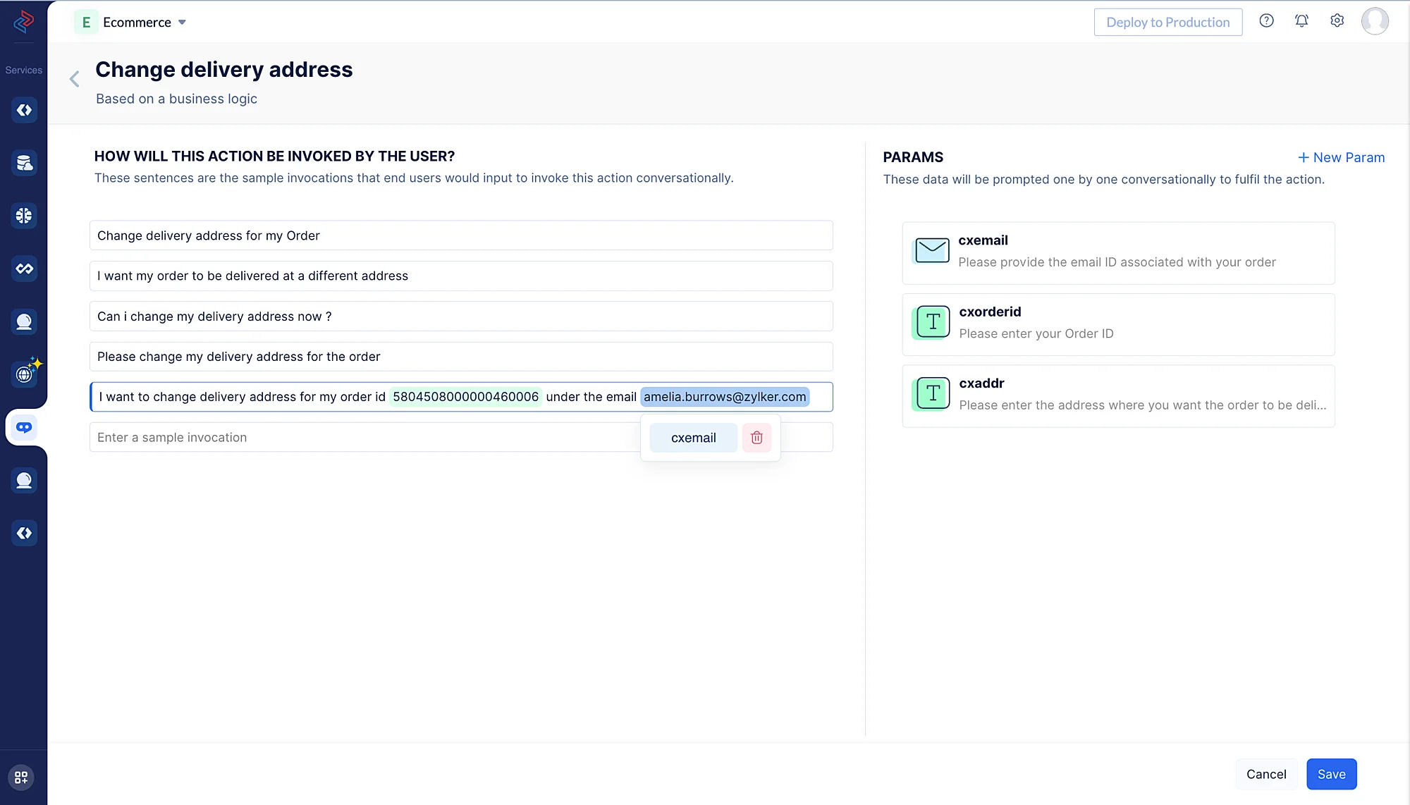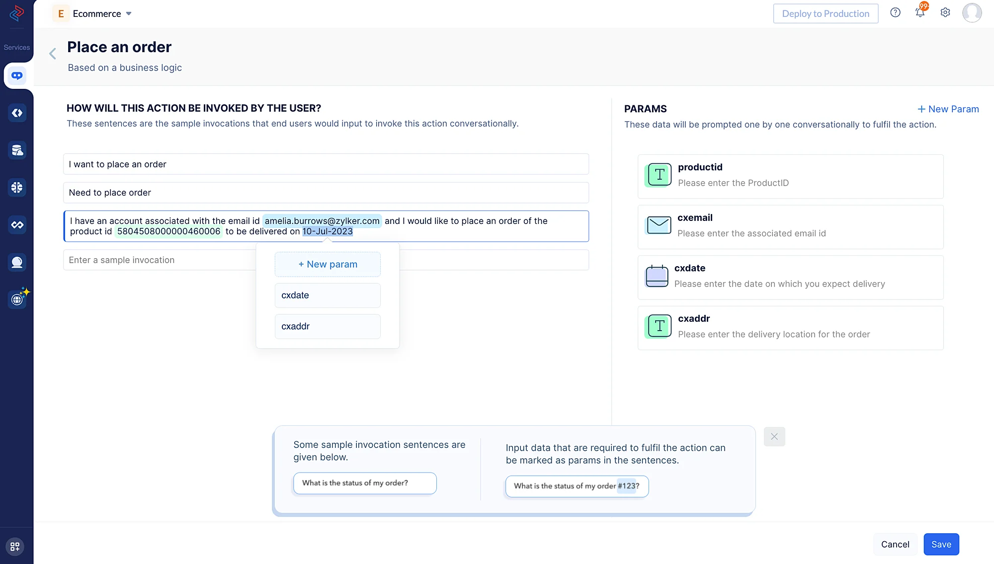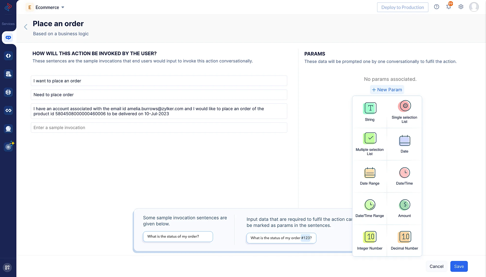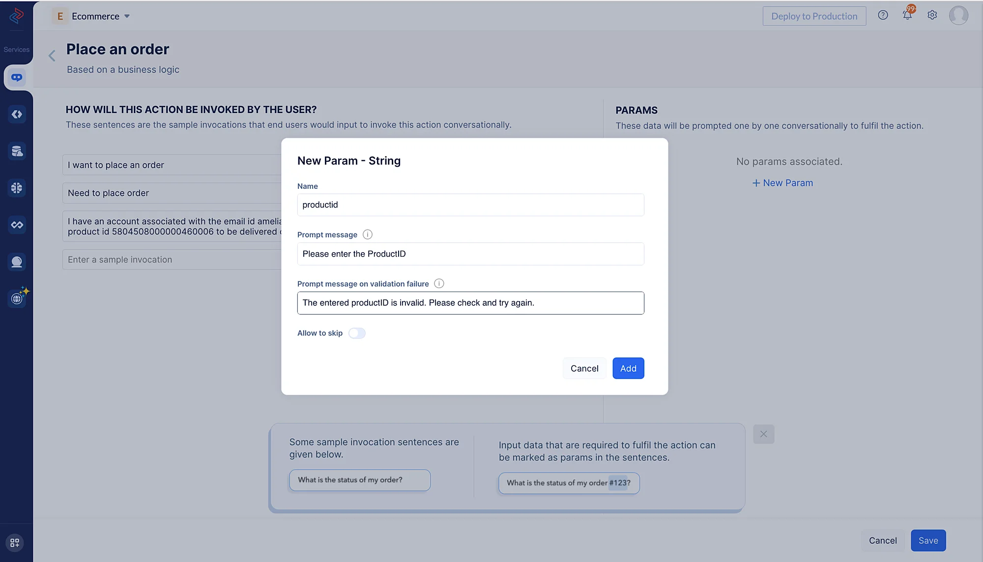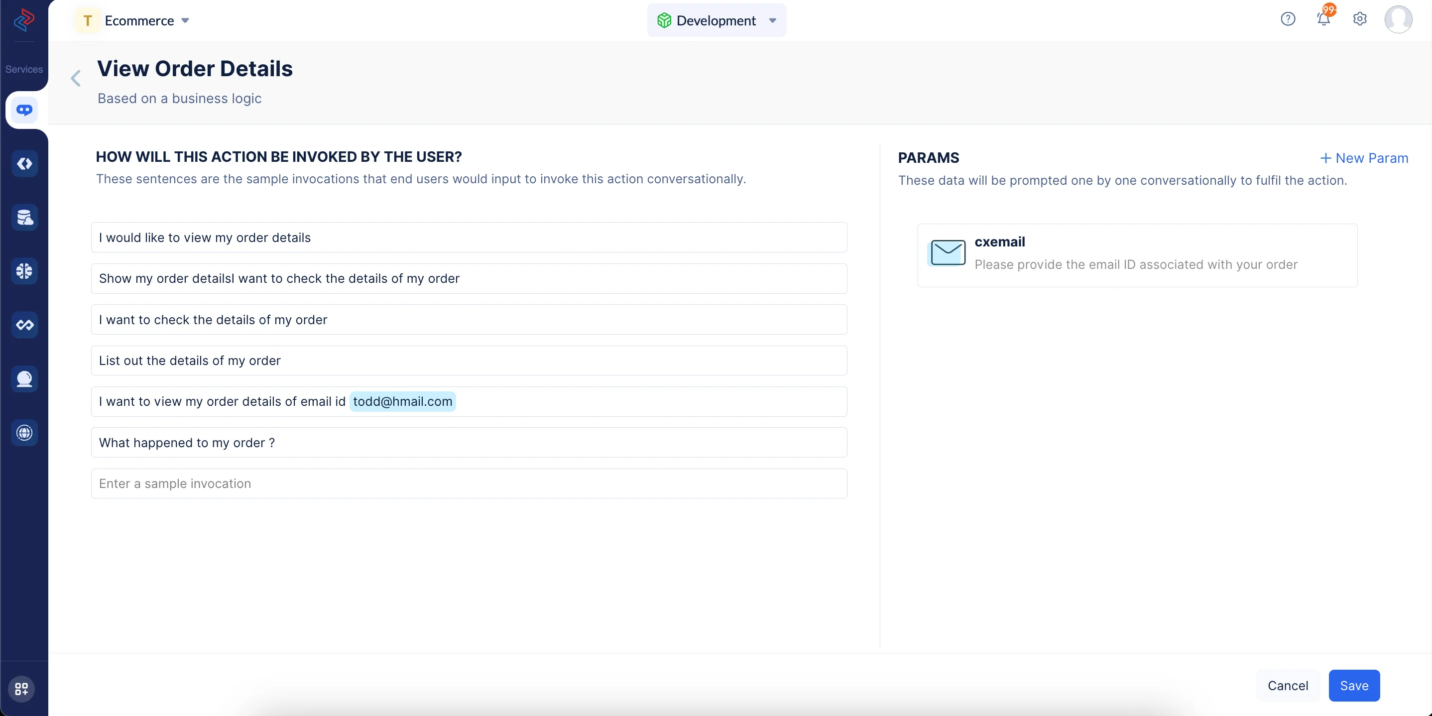 In order to configure an action based on your application’s specific needs, you must define the appropriate sample sentences and params for it. In this section, we will be discussing in detail about the sample sentences and params to be configured for the actions mentioned above for your ecommerce bot.