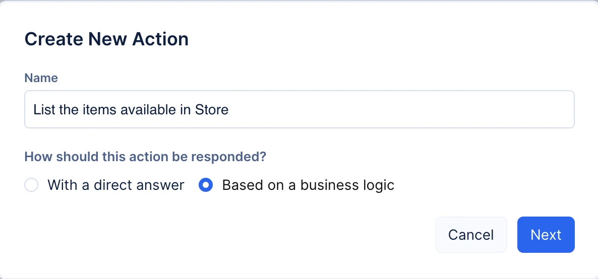 We will create the first action for our ecommerce bot to list the items available in the store. In the pop-up window that opens, provide the name of the action as “List the items available in Store”. Select the response as Based on a business logic and then click Next.