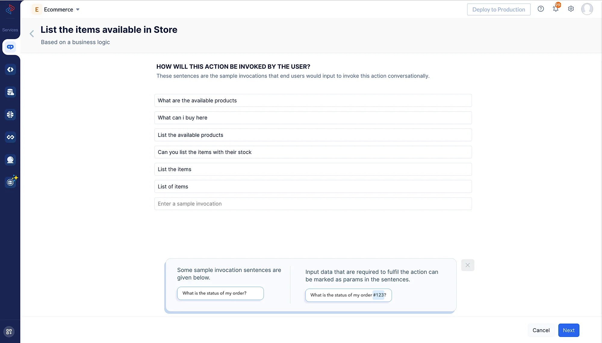 Configure the applicable sample sentences. In a conversational way, the user would prompt this action in many ways, such as “list the items available”, “what are the products available in the store?”. You can configure similar sentences as the sample sentences for the action and Click Next.