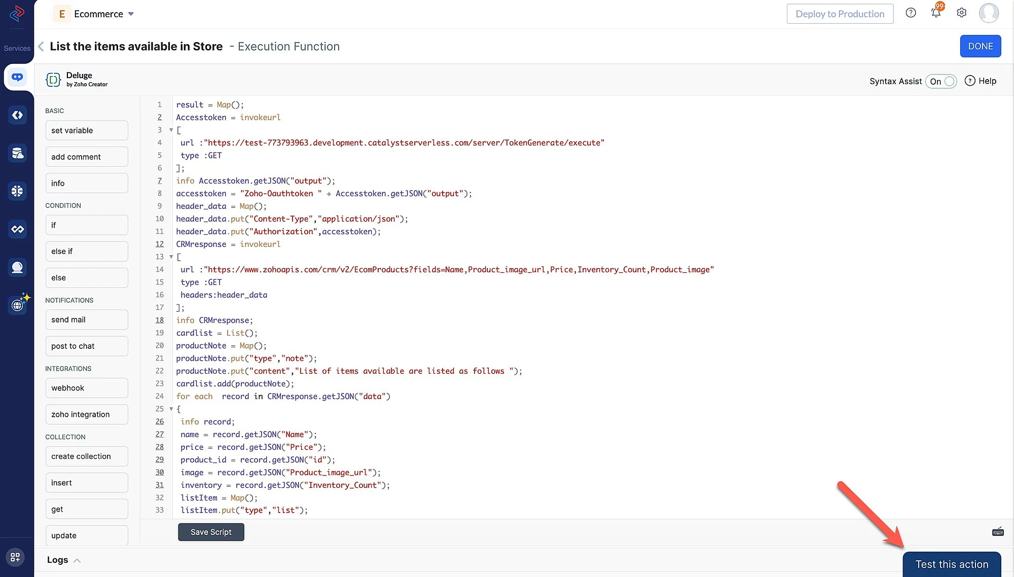 - Click Test this action at the bottom right corner of the page to test the configurations being made to the current action.
