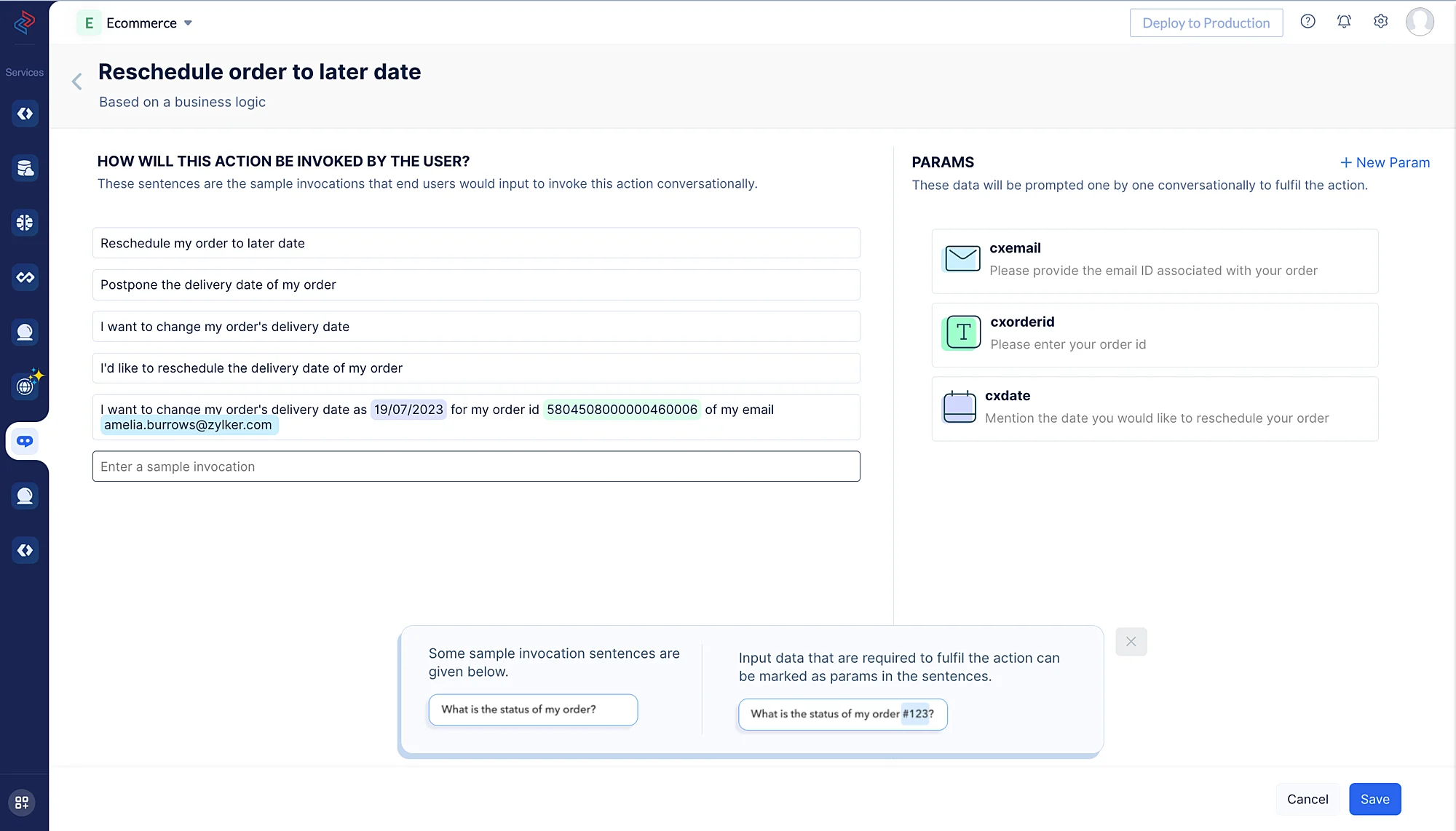 - Enter the name of the action as “Reschedule order to later date”. For this action, you can define the sample sentences given below:
