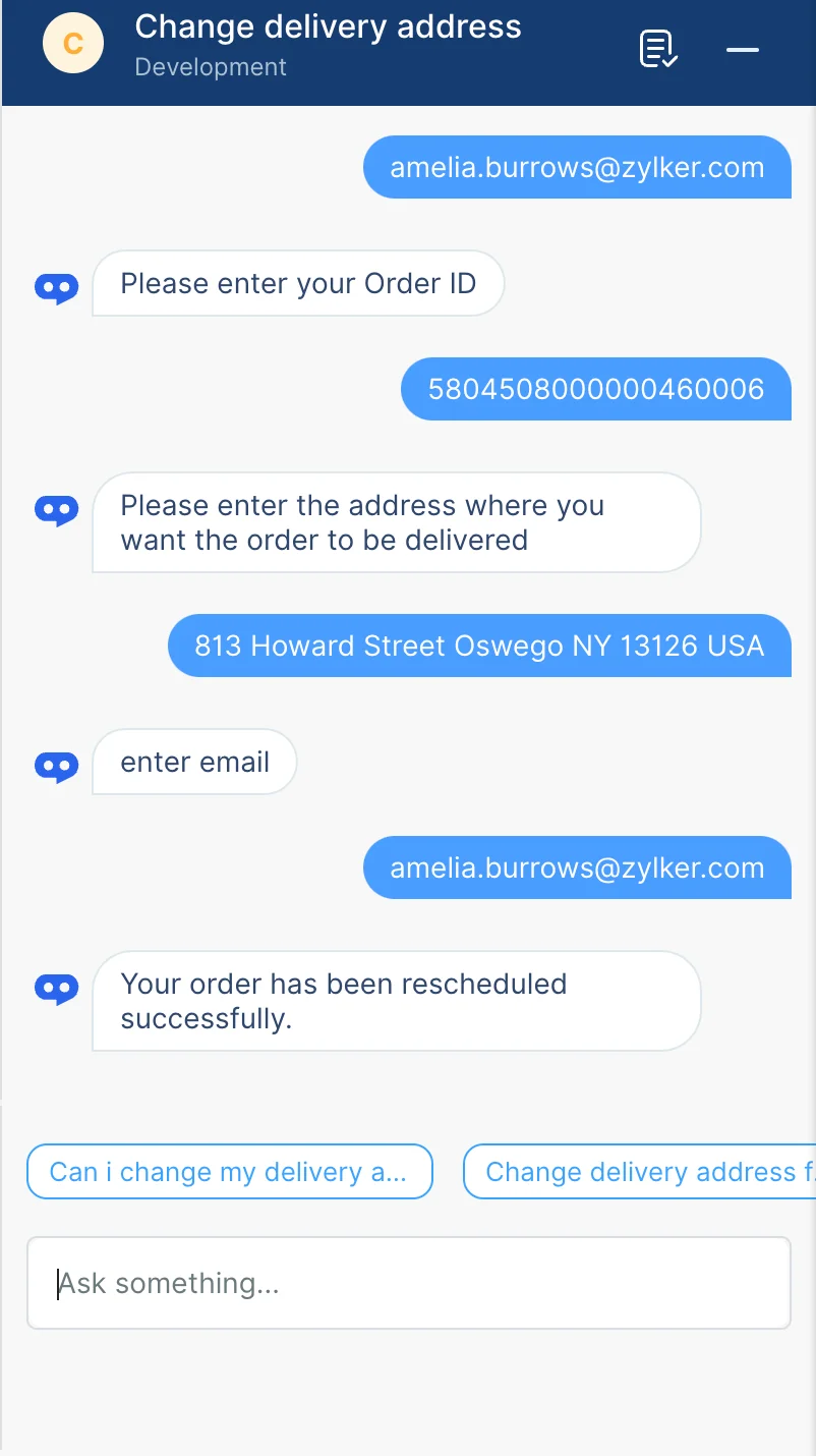 - “I want to change delivery address for my order id 5804508000000460006 under the email amelia.burrows@zylker.com”