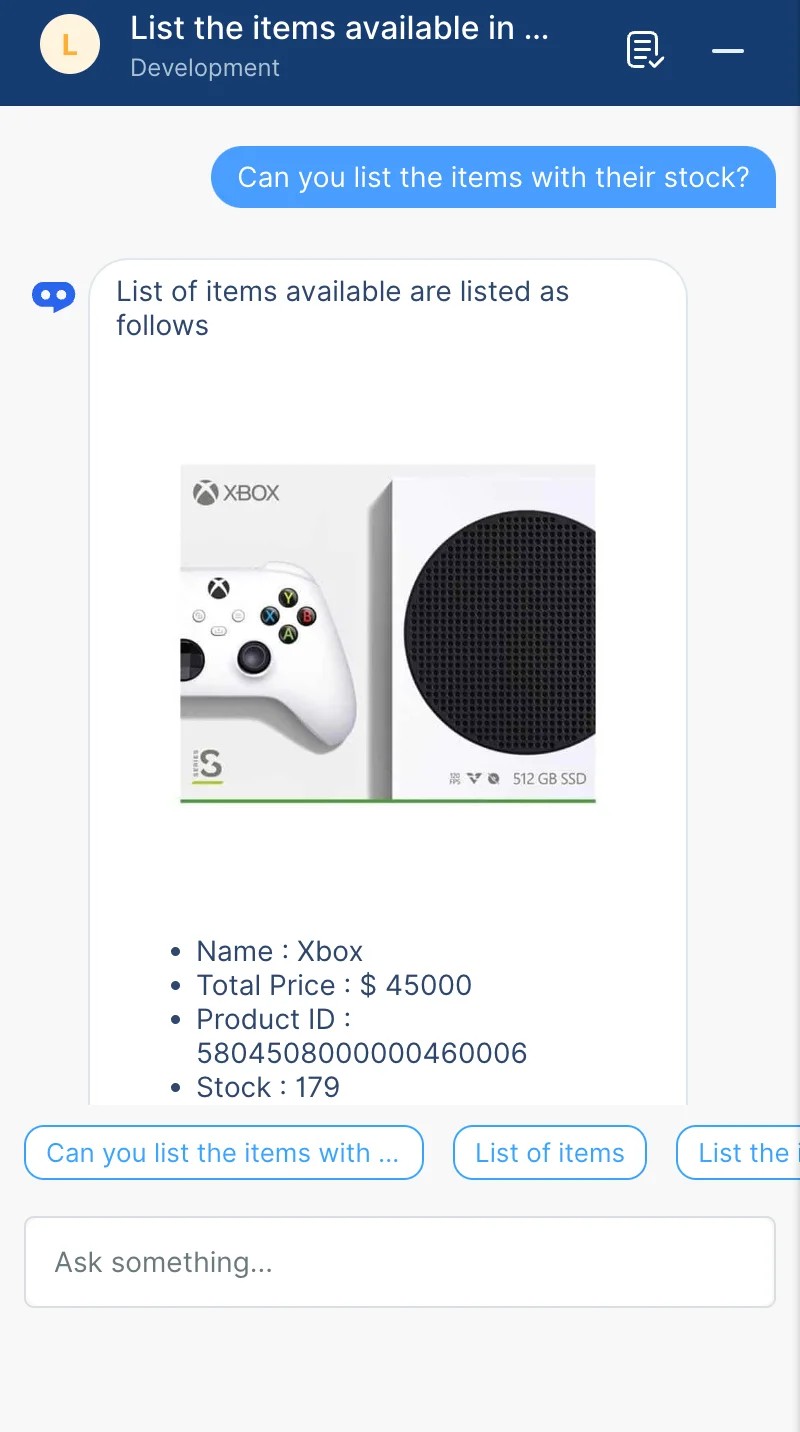 For example, enter “Can you list the items with their stock” in the chat window. The bot understands the intent of the message and tries to find a match with the defined sample sentences and executes the business logic to provide the response.