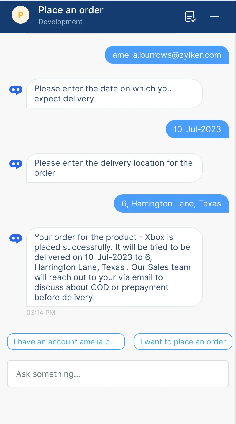 “I would like to place an order of the product id :5804508000000460006 to be delivered on 10-Jul-2023”