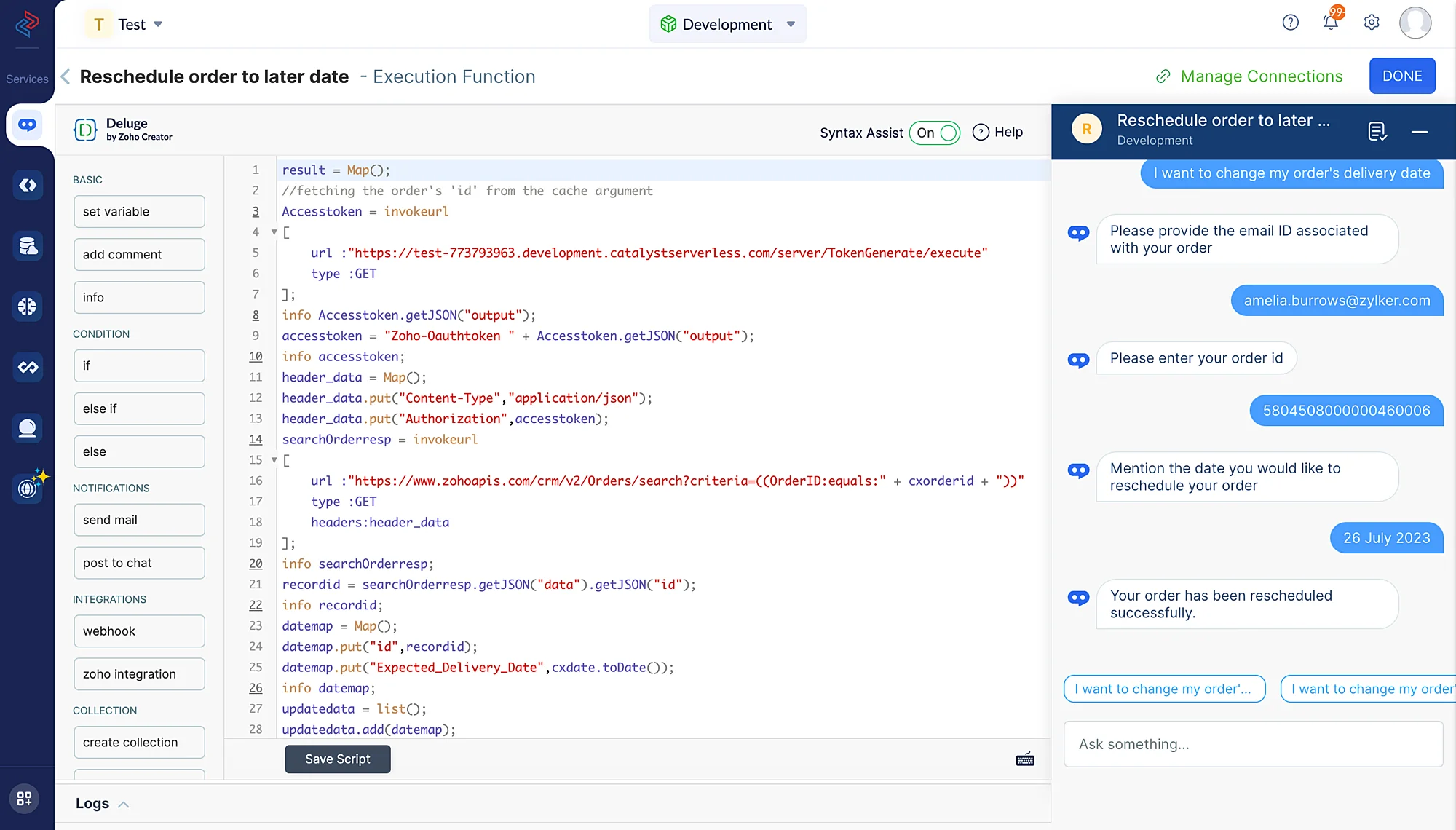 - “I want to change my orders delivery date as 19/07/2023 for my order id 5804508000000460006 of my email amelia.burrows@zylker.com”