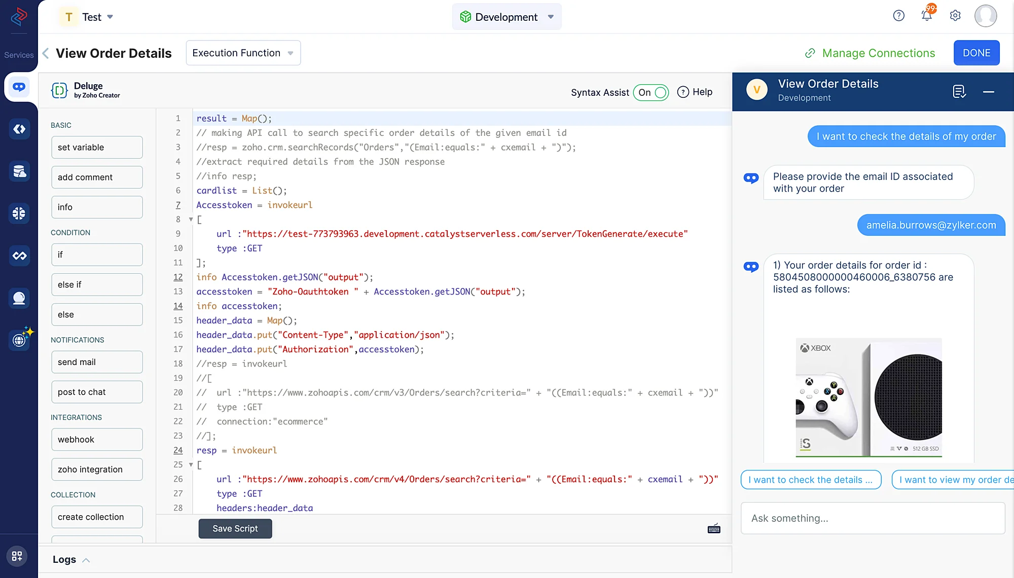 Since we have chosen to build the business logic of the ConvoKraft bot using Deluge, the Execution function will be enabled by default.