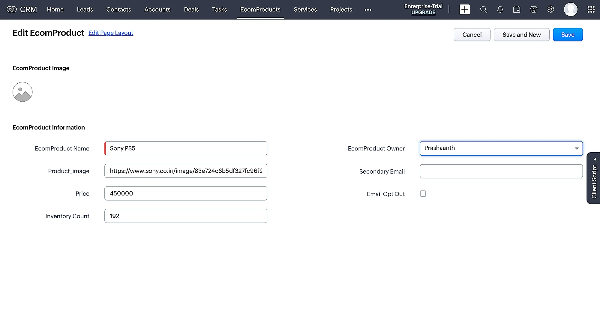 You can create any number of products by adding them as records in the module. Click on Create EcomProduct and provide the details for the fields, and click Save.