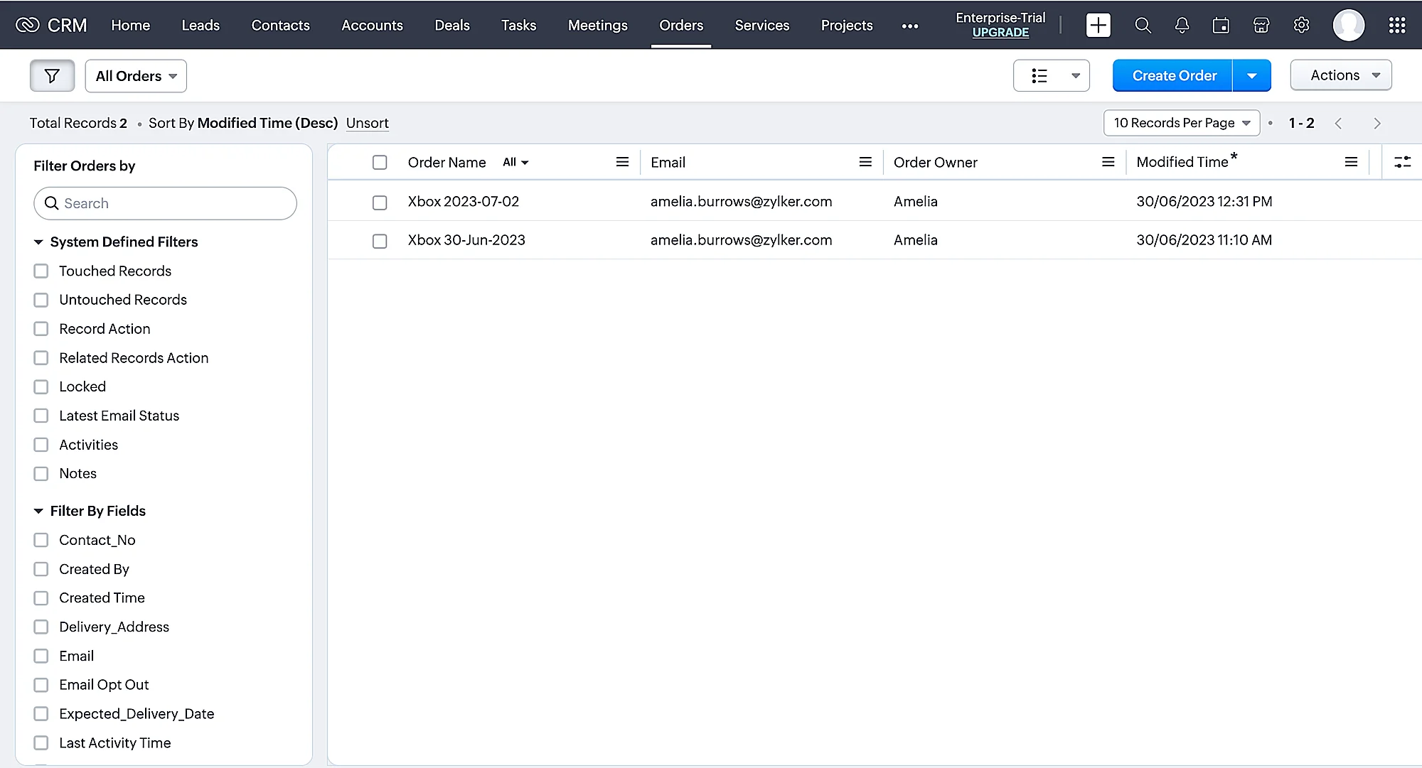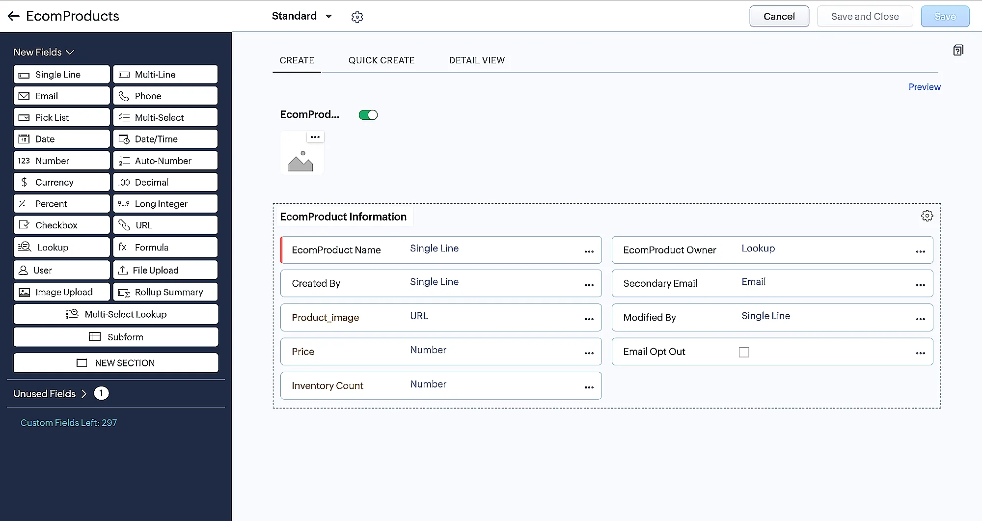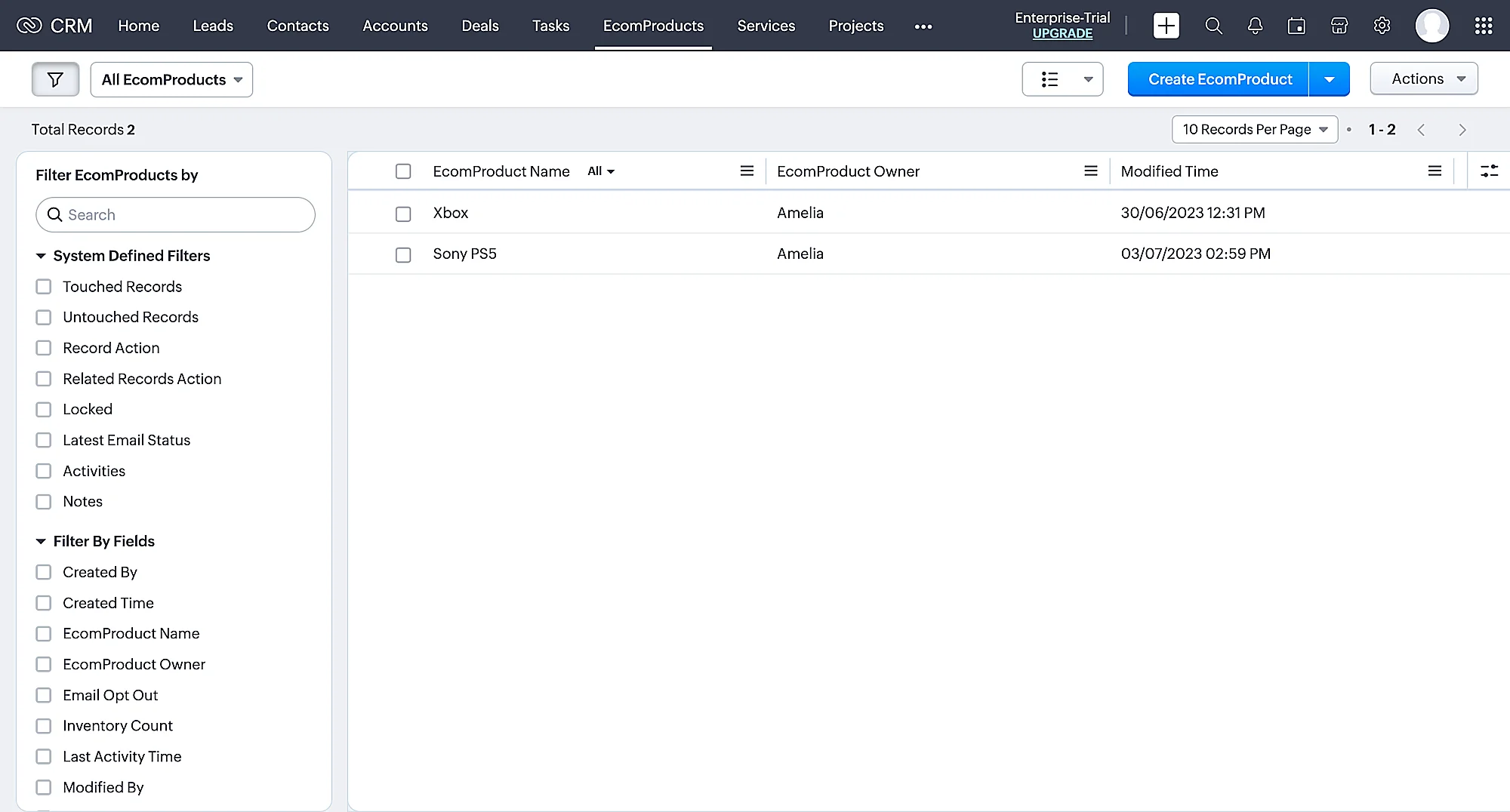 Modules in Zoho CRM, let you categorize and track various aspects of your business. We will be creating two custom modules namely EcomProducts and Orders for storing the product inventory and the orders placed respectively. You can learn more about custom modules from the CRM documentation.
