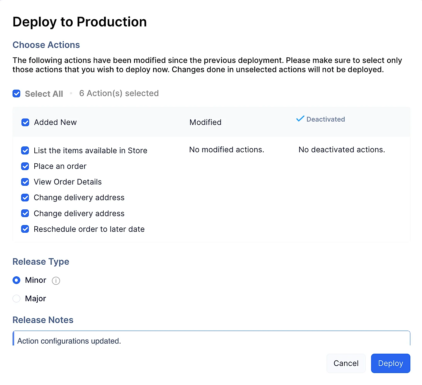 In the Deploy to Production dialog box, select all the updated actions and choose the release type as Major. You could also add descriptive release notes, if required.