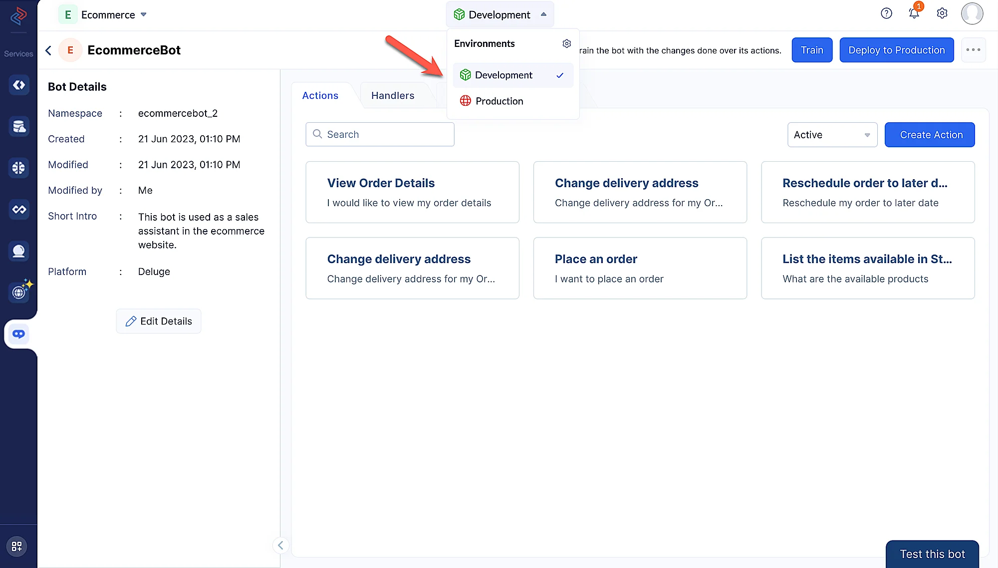After you have tested the ecommerce bot in the development environment, you can proceed to deploy the bot to the production environment. This is done by deploying the specific ConvoKraft bot alone, and then the entire project to production to enable the deployment of the associated function.