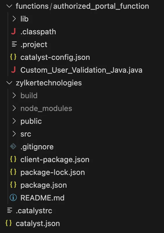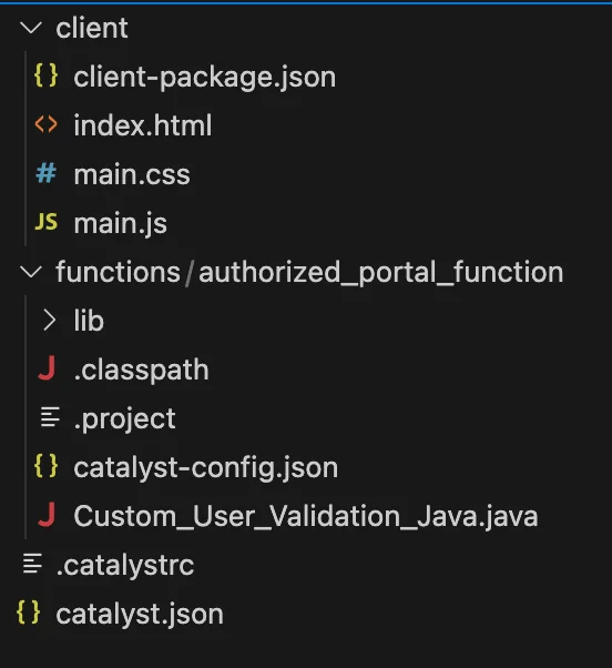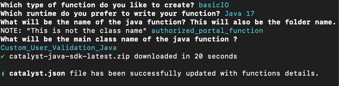 Enter “authorization_portal_function” as the folder name, “Custom_User_Validation_Java” as the class name, then press Enter. The functions directory will be created in your project directory with the configuration files and dependencies, along with the catalyst.json and a hidden .catalystrc file.