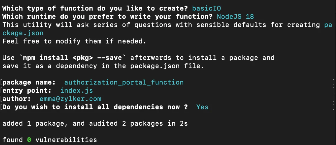 Enter “authorization_portal_function” as the package name, “index.js” as the entry point, and your email address as the author, then press Enter. Alternatively, you can press Enter without entering inputs to fill in the default values. The CLI will prompt the initialization of the Node dependencies. Press Y to confirm the installation, and press Enter to confirm your choice. The Node modules will be installed.