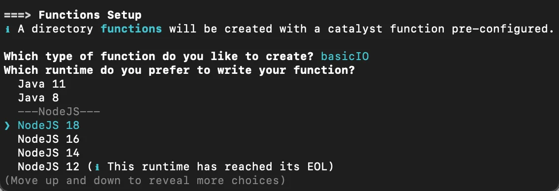 The CLI will initiate the function setup. Select Basic IO as the function type for your Custom User Validation function.