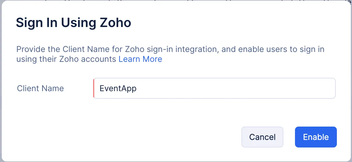 - Now, you will be able to enable Social Logins. This will allow your users to sign up to your application using their common social platform accounts. Click on the Zoho social login, and click Enable once you enter the application’s name as the EventApp.
