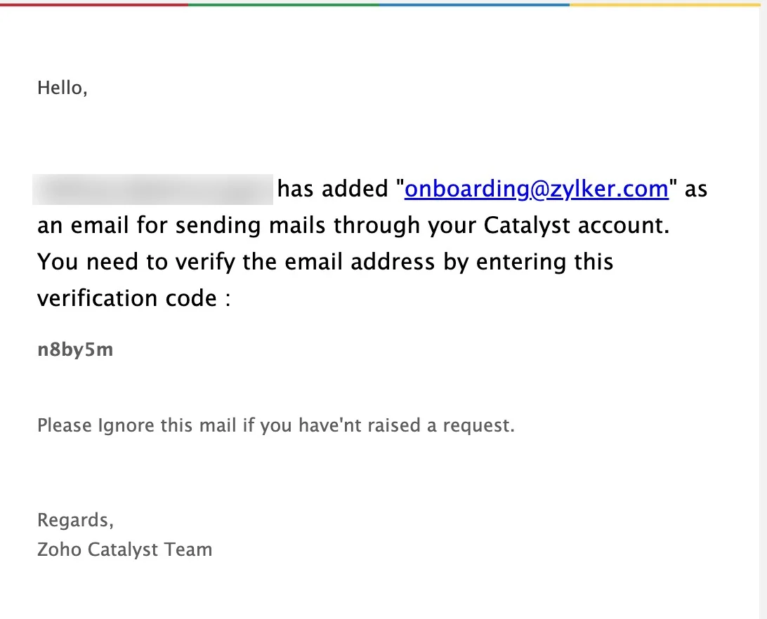 In this application, we are going to be sending the product tour emails from within the application to the end-user using the Catalyst Cloud Scale Mail component. You can configure the email address as follows: