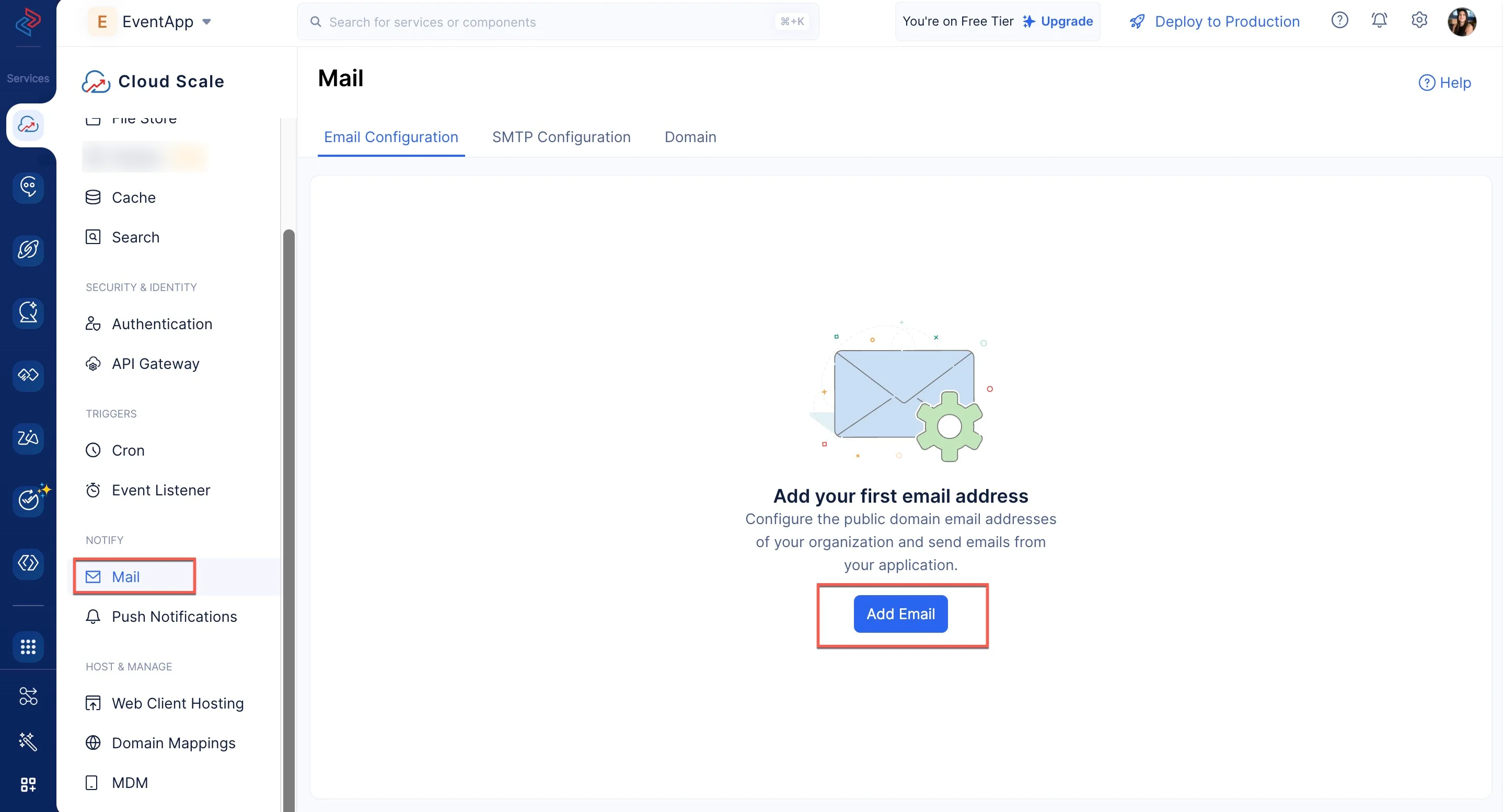 Navigate to the Mail component present under the Notify section in the Cloud Scale section of the console.