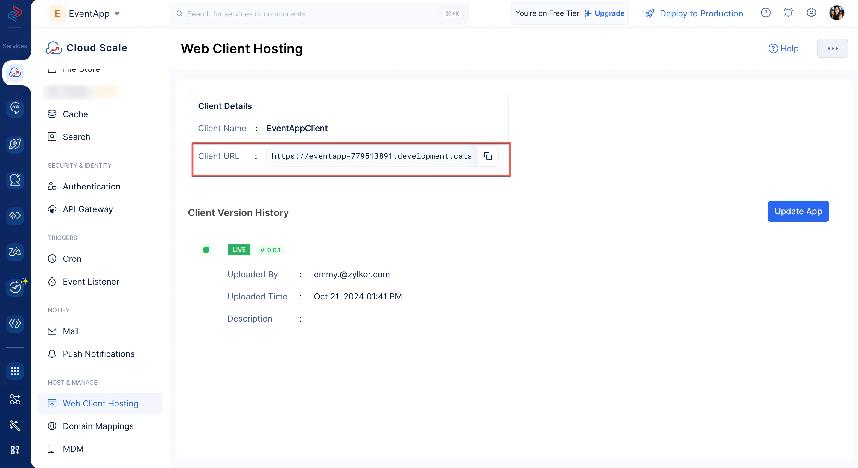 You can copy the application URL from the CLI, or you can copy it from the Web Client Hosting component.