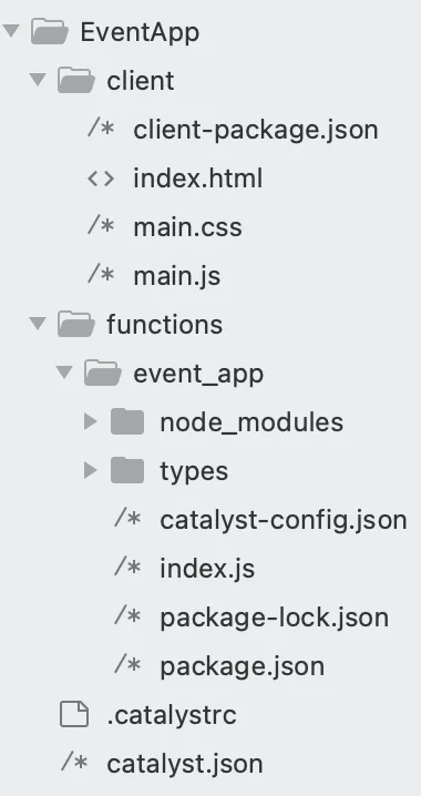 The project directory is now set up with the client directory and the functions directory along with configuration files and dependencies. The project directory also contains the catalyst.json configuration file and a hidden .catalystrc file.
