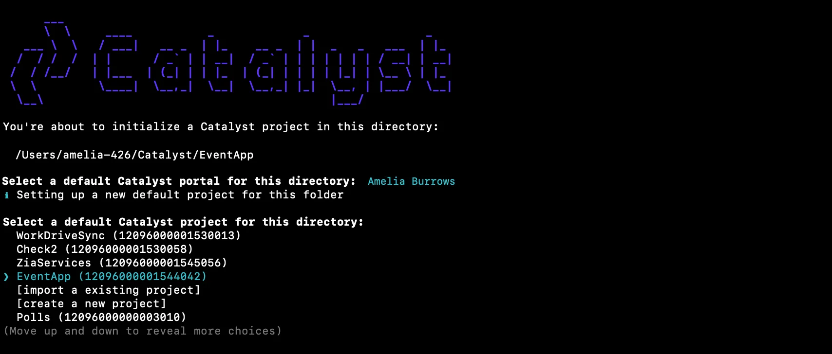 The CLI will now ask you to associate a Catalyst project with the directory. Associate it with the project that we created earlier from the console. Select EventApp from the list and press Enter.