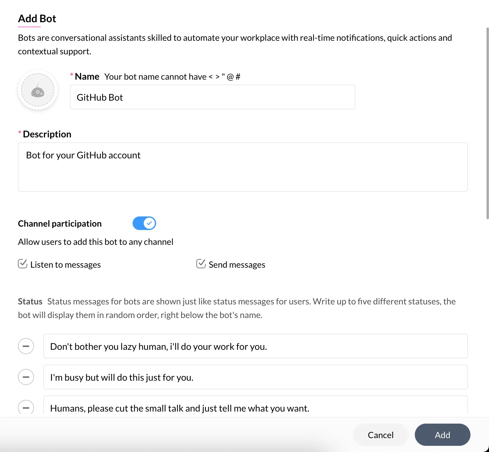 - Finally, we will add a Bot component and configure the name as “GitHub Bot”. Give a description as shown in the screenshot below.