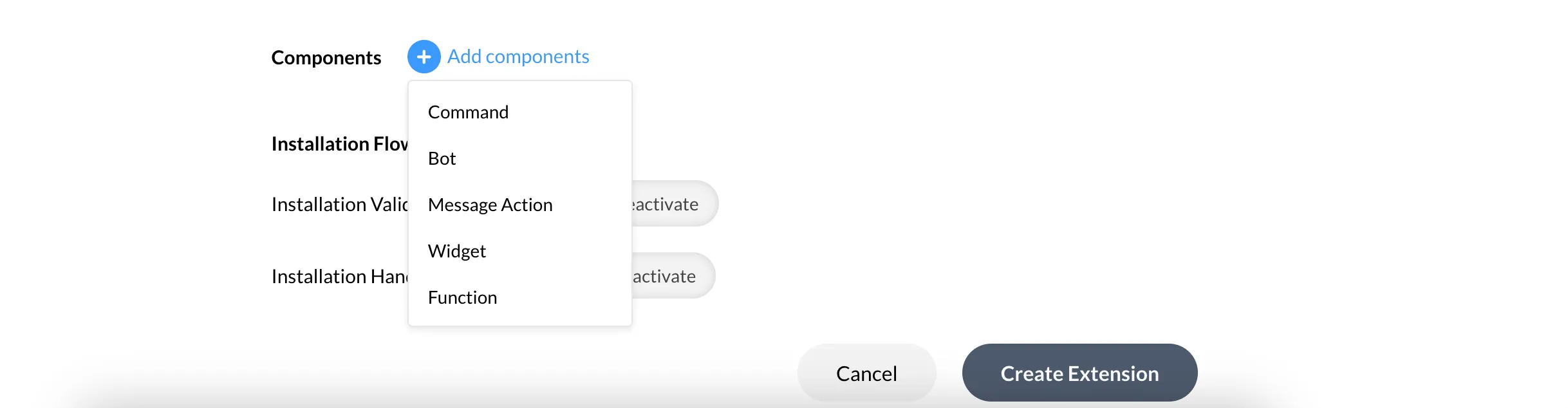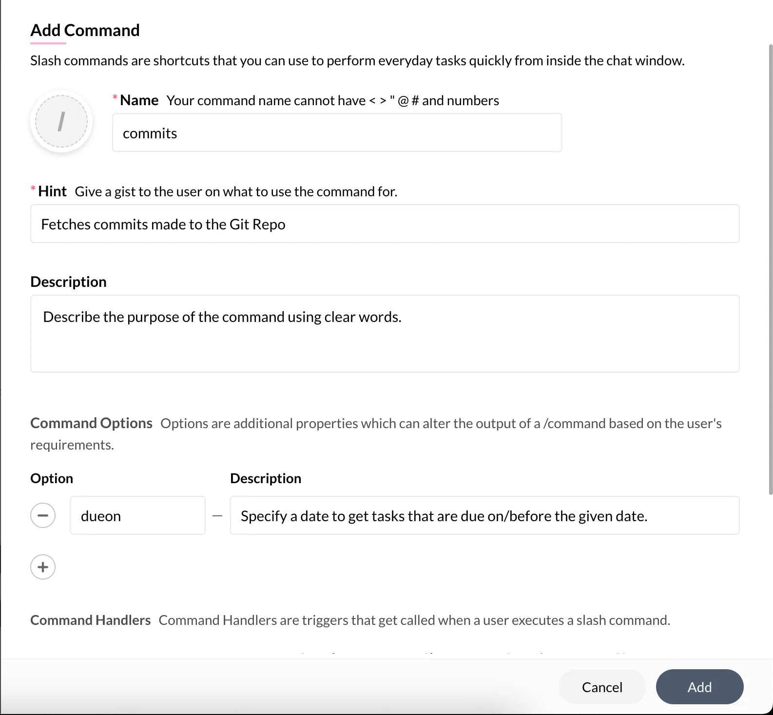 - Similarly, click the Add components button in the extension configuration again, then click Command. Provide the name of the command as “commits”. Make sure to implement the same configuration as that of the issues command here as well. Click Add.