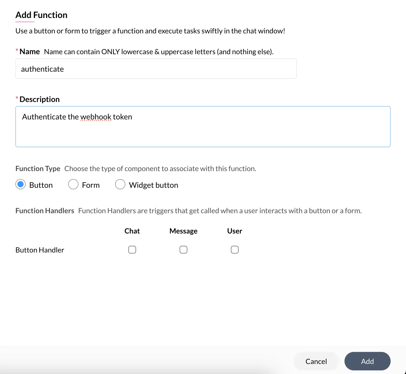 - Next, we will add a Function component. Provide the name of the function as “authenticate”. Give a description for the function as shown in the screenshot below.