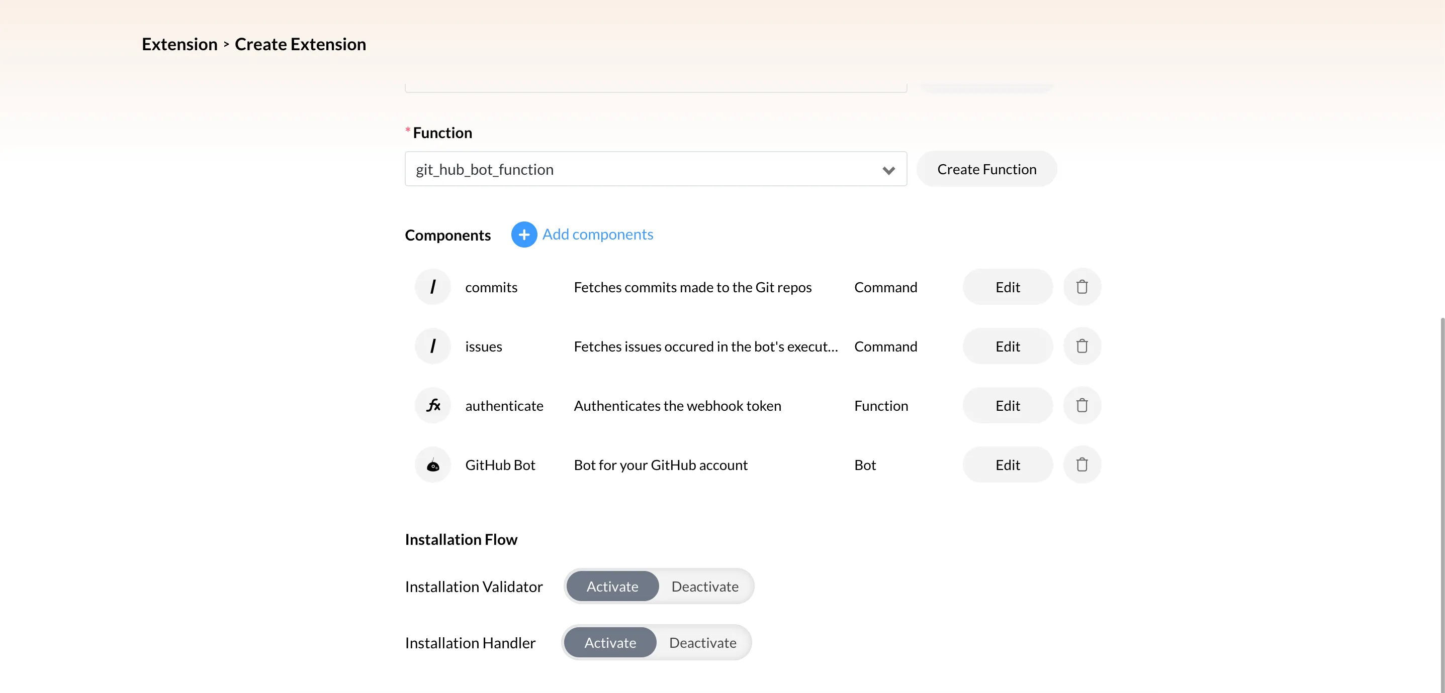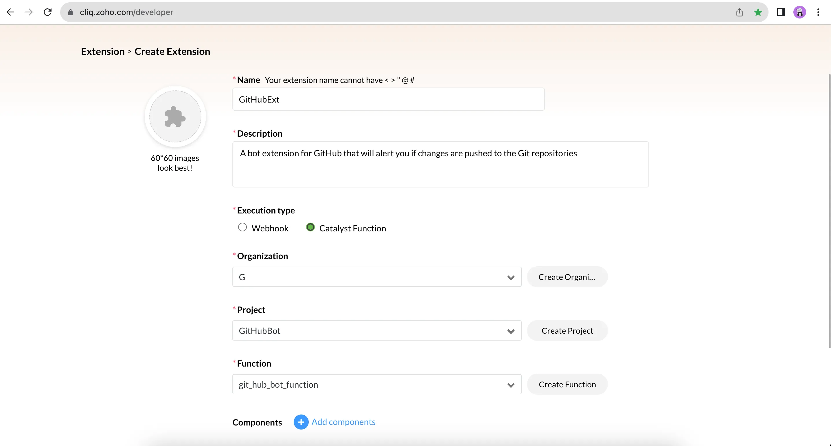 Select the execution type as Catalyst Function. Choose your organization in which you have created the project in this step. Select the project GitHubBot and the function git_hub_bot_function from the dropdown list. This allows the extension to invoke the function whenever any of the components in the extension are accessed.