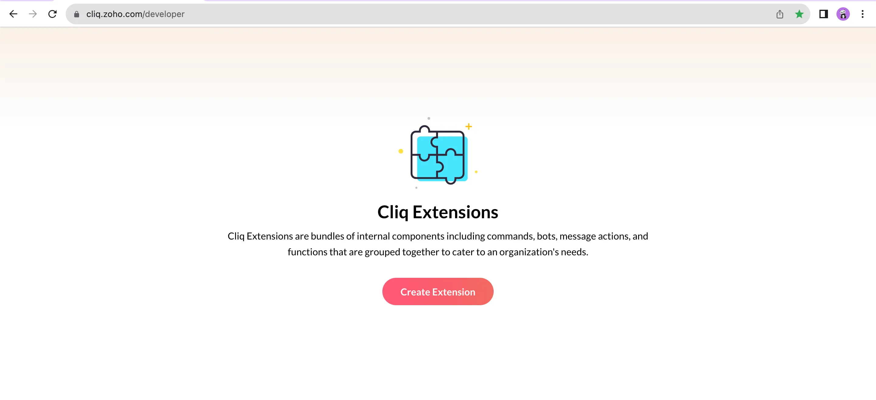 - Log in to your Cliq account and open the Cliq developer console. Click Create Extension.