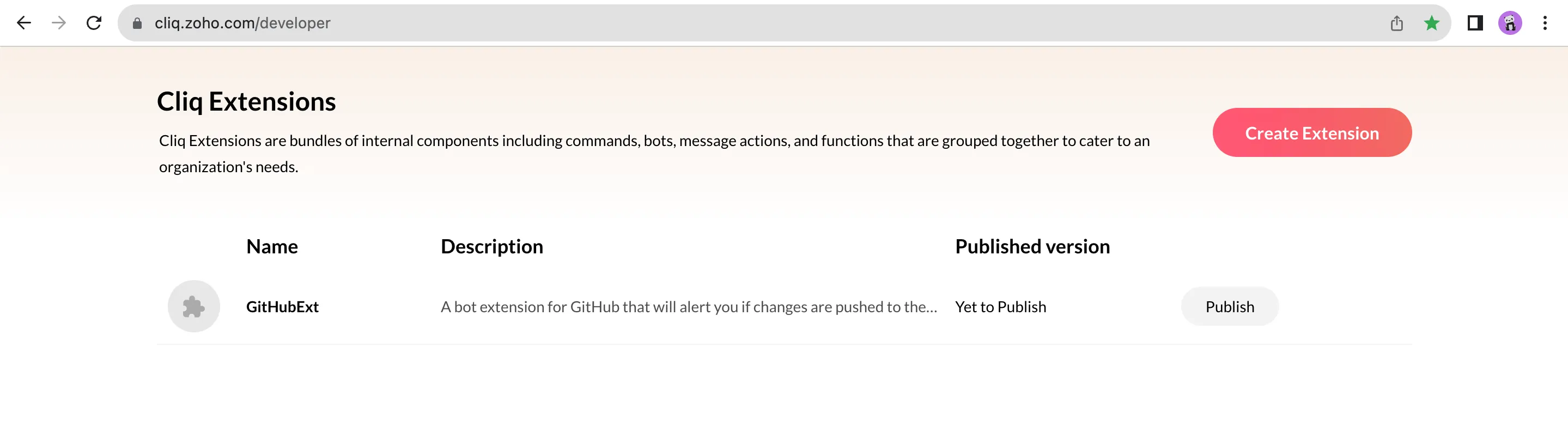 - Click Create Extension in the extension configuration page and the created extension will be listed in the Cliq developer console under the Cliq Extensions section.