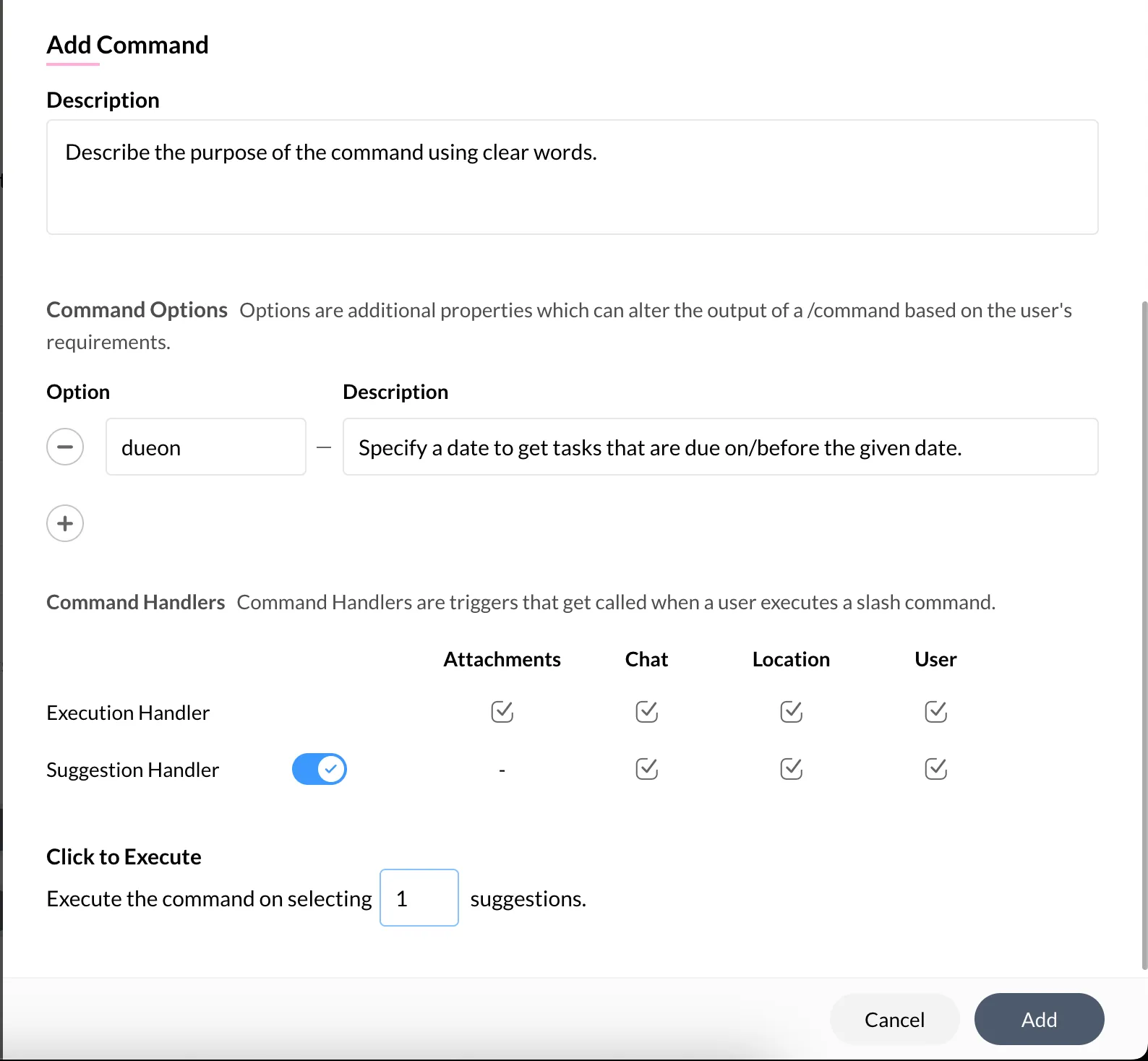 In the Command Handlers section, choose Attachments, Chat, Location and User for the Execution Handler. Enable the Suggestion Handler and allow access for Chat, Location and User. Configure the command to execute on selecting only one suggestion. Click Add.
