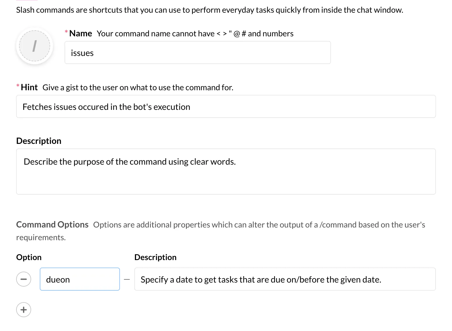 - Enter the command’s name as “issues”. Provide a hint for the command as shown in the description below.