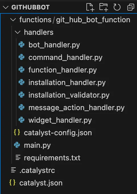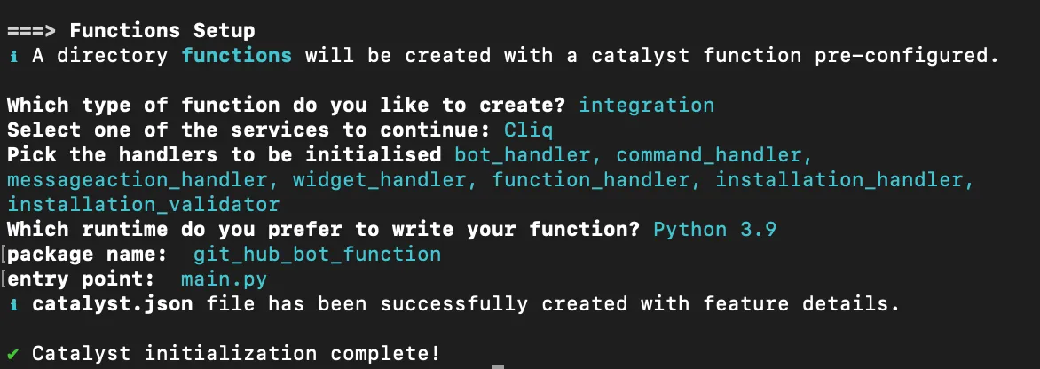 Your project directory is now set up with the functions directory (CATALYST_FUNCTIONS_HOME) along with configuration files and dependencies. The project directory also contains the catalyst.json, a requirements.txt file and a hidden .catalystrc file.