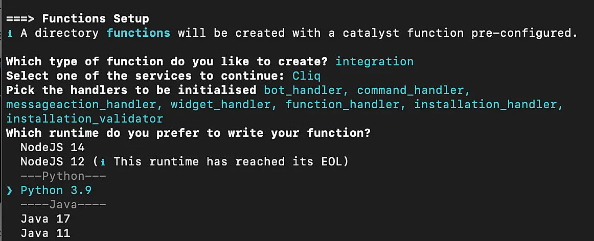 - The CLI will initiate the function setup. Select Integration as the function type.