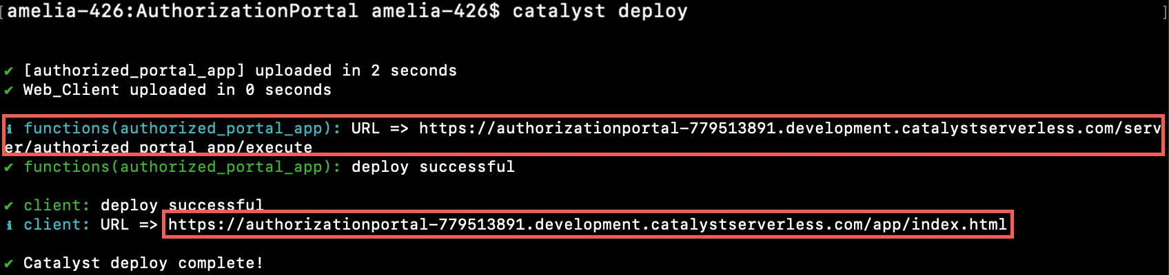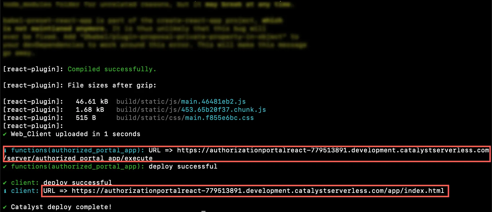 The function is deployed first, followed by the client component. The URL endpoints of the components will be displayed in the CLI:
