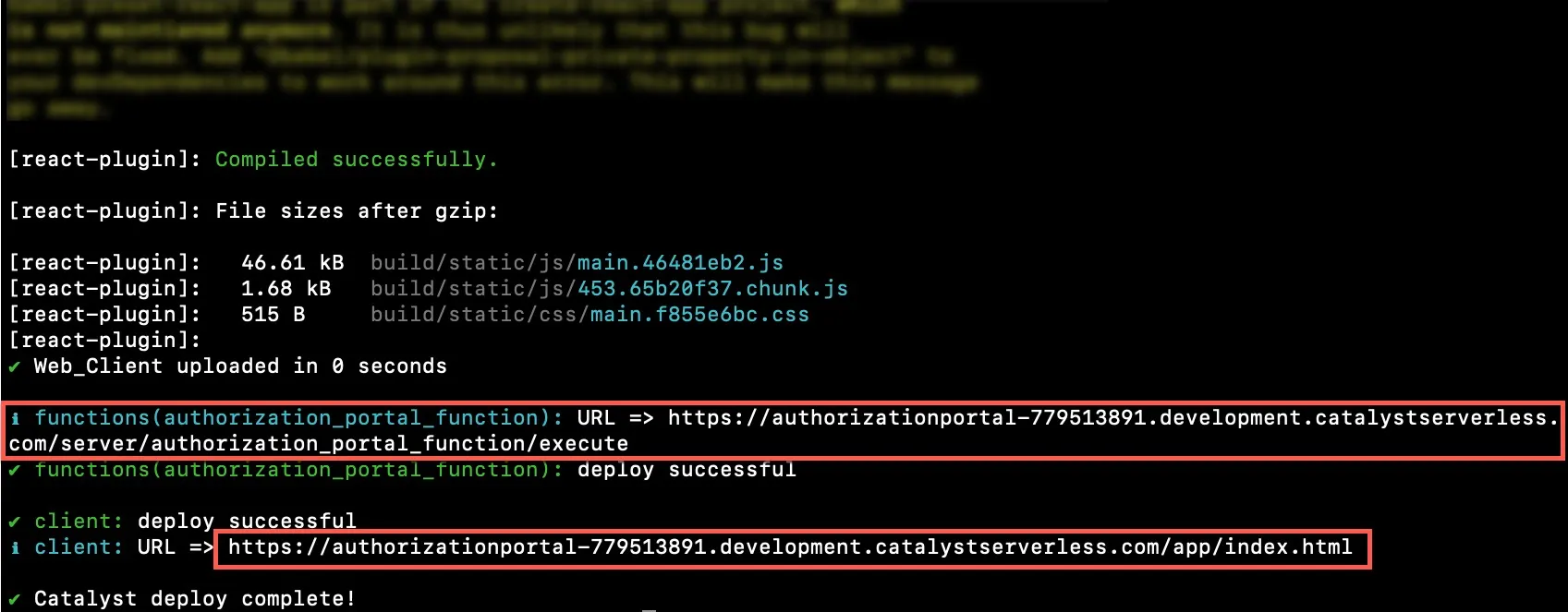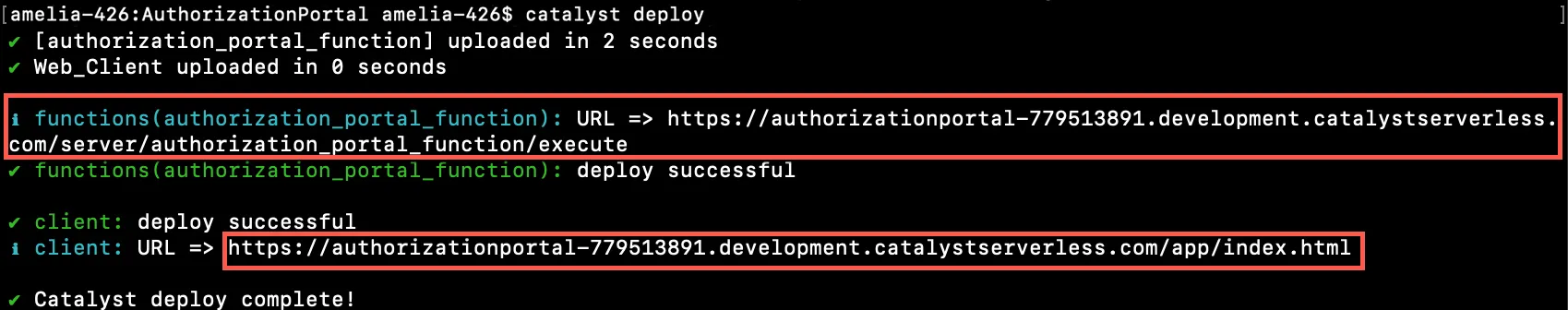 The function is deployed first, followed by the client component. The URL endpoints of the components will be displayed in the CLI: