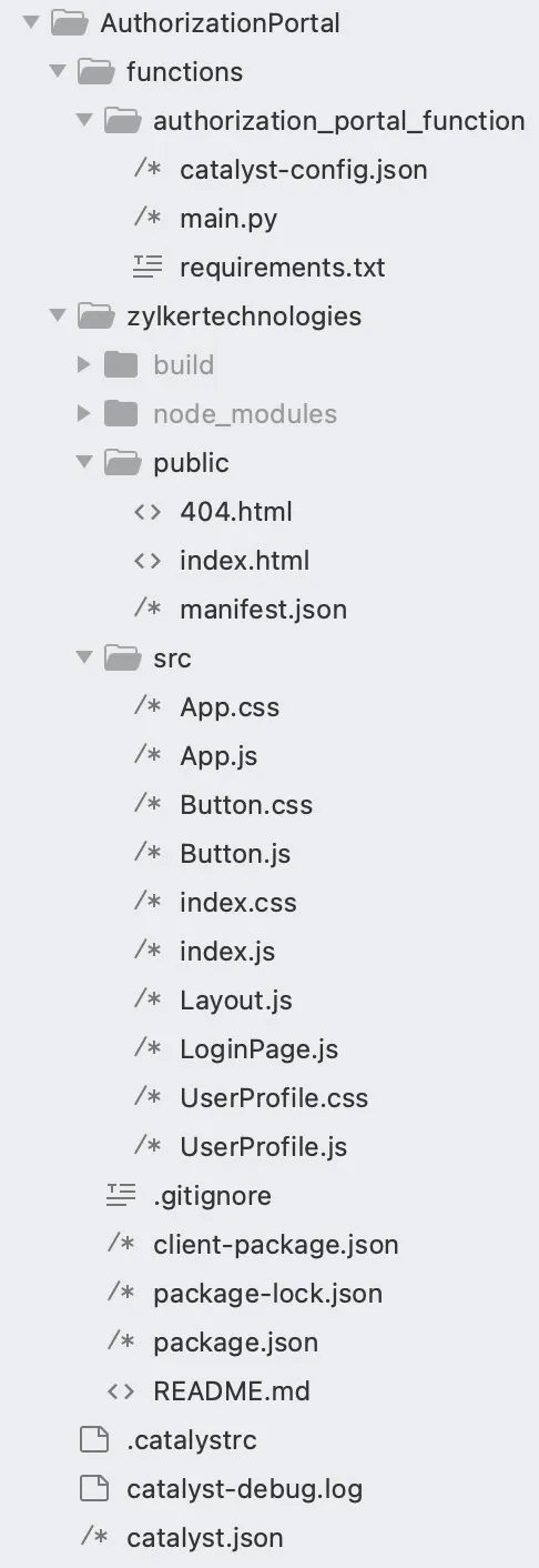 This is the structure of the Authorization Portal project’s directory if the client is initialized as a React app.