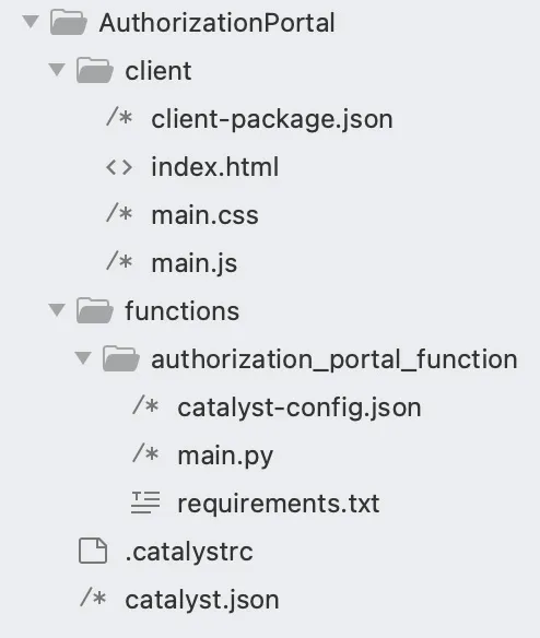The project directory is now set up with the client directory and the functions directory along with configuration files and dependencies. The project directory also contains the catalyst.json configuration file and a hidden .catalystrc file.