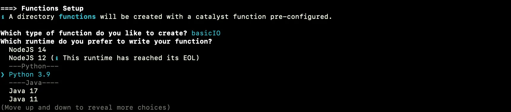 The CLI will initiate the function setup. Select Basic IO as the function type for your Custom User Validation function.