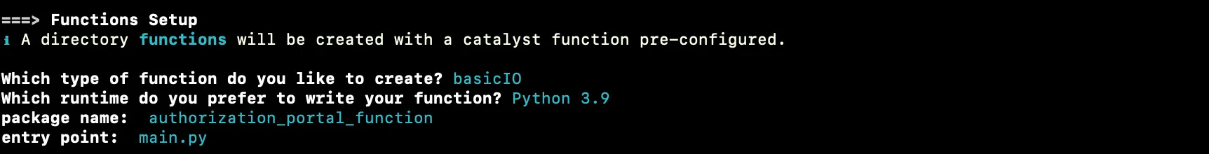 Enter “authorized_portal_function” as the package name, “main.py” as the entry point, and your email address as the author, then press Enter. Alternatively, you can press Enter without entering inputs to fill in the default values.