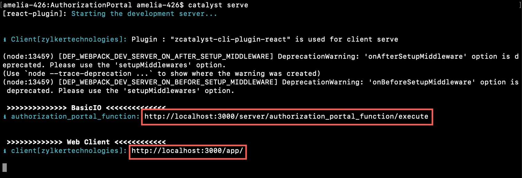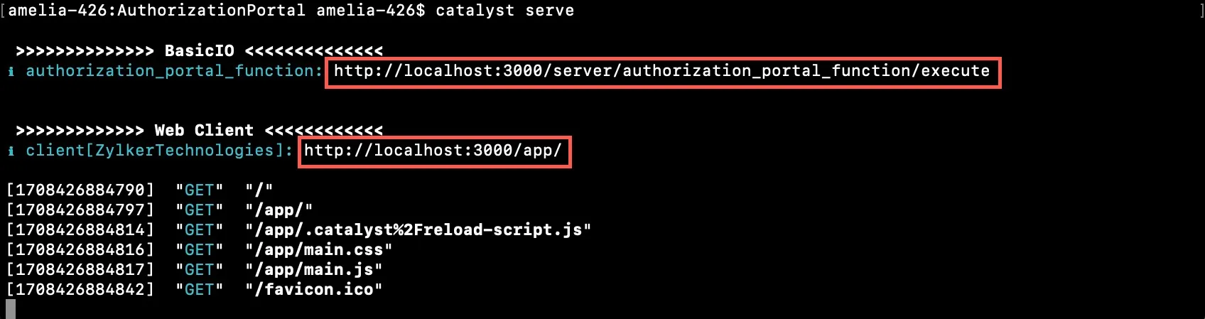 The authorization portal application will now be served at default port 3000. The local endpoint URLs of the components will be displayed in the CLI.