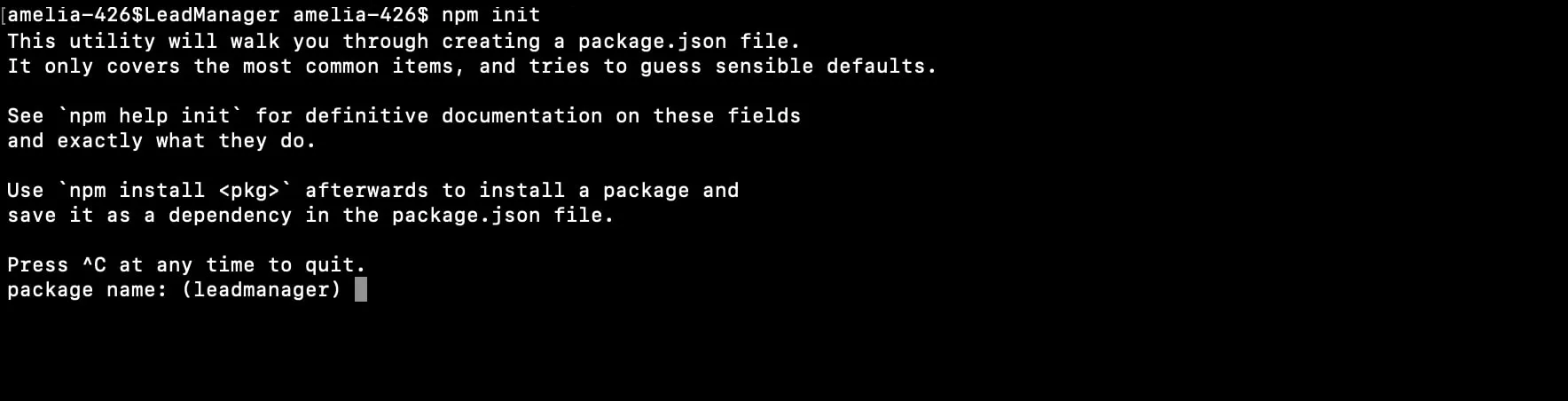 Enter “leadmanagerapp” as the package name, and “index.js” as the entry point. You can also just click Enter to use the default names generated by NPM, or enter any name of your preference.